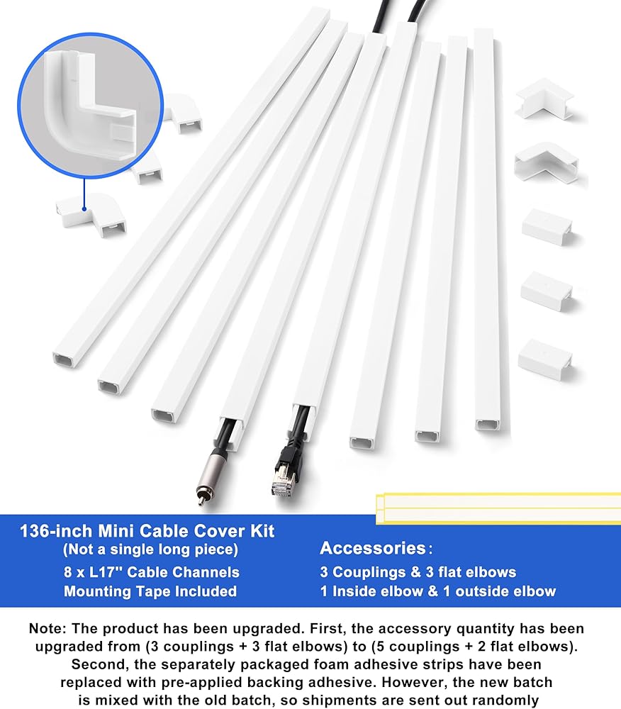 خافيسيل الكابلات بحجم 136 بوصة (ليست قطعة طويلة واحدة): تشتمل مجموعة إدارة الكابلات هذه على 8 قنوات ، كل قناة كابل تبلغ 17 '' × 0.59 '' wide x 0.40 '' ؛ الحواف السلسة تسمح اتصالات سلسة. تضم الملحقات 5 أدوات توصيل ، 2 كوع مسطح ، 1 داخل الكوع ، 1 خارج الكوع. شريط PE المميز المسبق مسبقًا