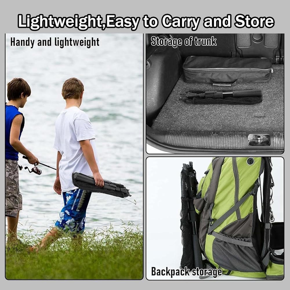 • Telescoping & Portable Fishing Net: Features a collapsible aluminum handle (16" to 23") and compact folding design for effortless transport and storage. Perfect for boat, river, lake, or beach fishing. Includes a built-in belt clip for quick access