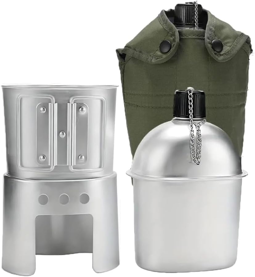 This outdoor cookware set includes an 850ml canteen, 600ml mug, and wood stove, making it perfect for camping, hiking, survival, and outdoor adventures.