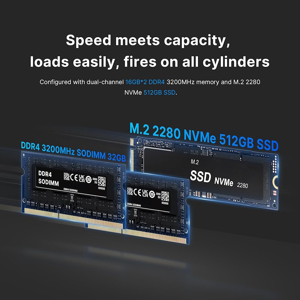 RAM & SSD: 32GB (16GB × 2) DDR5 4800MHz SODIMM ، 1 تيرابايت PCIE 4.0 X4 SSD ، مع معدل نقل الحد الأقصى 8000 ميجابايت/ثانية. يتميز المنتج بفتحتين SSD ، مما يتيح التوسع بحد أقصى 8 تيرابايت (4 تيرابايت × 2).