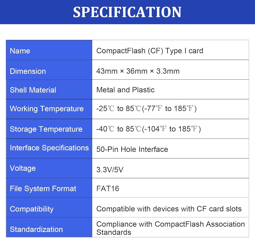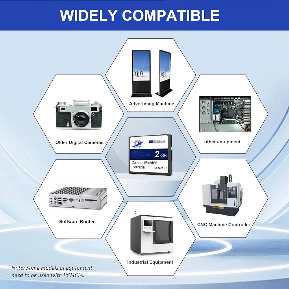 توافق واسع: بطاقة Flash (CF) من النوع الأول متوافق مع آلات الإعلانات والمعدات الصناعية والكاميرات الرقمية القديمة والأجهزة المضيفة الأخرى مع فتحات بطاقة CF
