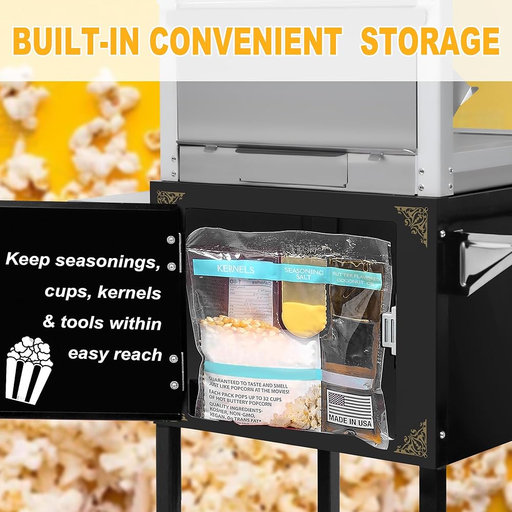 عربة آلة الفشار المحمولة: يتم تثبيت آلة صانع الفشار على عربة خدمة بإطارات مقاس 14 بوصة على طراز الدراجات ، وهي مستقرة وسهلة النقل والإصلاح. تحتوي العربة أيضًا على خزانة تخزين ورف بحجم 8 بوصات لسهولة التخزين والراحة