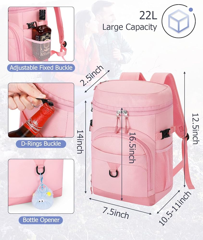 Spacious Capacity: This insulated picnic backpack has 22L capacity and multi-pocket, measuring 10.5” x 7.5” x 16.5”. The waterproof cooler backpack can hold up to 25 cans, making it perfect for your outdoor adventures. It features a roomy zippered main compartment, a top zipper pocket for snacks or personal items, two front zippered pockets for utensils and napkins, two mesh side pockets for bottles / wine, and whth a beer opener on the strap,it provides convenient storage for all your needs.