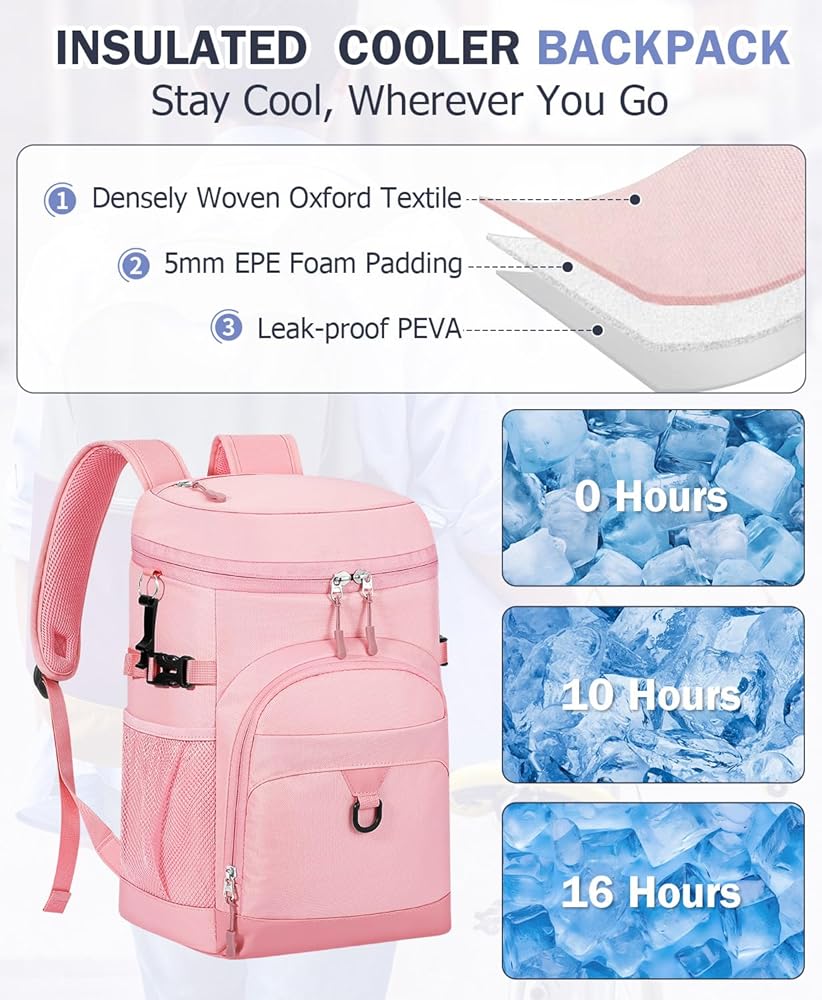 Leak-Proof Cooler Backpack Design: Made with upgraded thick PEVA material and seamless hot-pressing technology, our cooler backpack effectively prevents any leakage issues. Whether you're carrying ice, beer, or beverages, you can take this backpack cooler with confidence—no need to worry about messy spills or leaks.