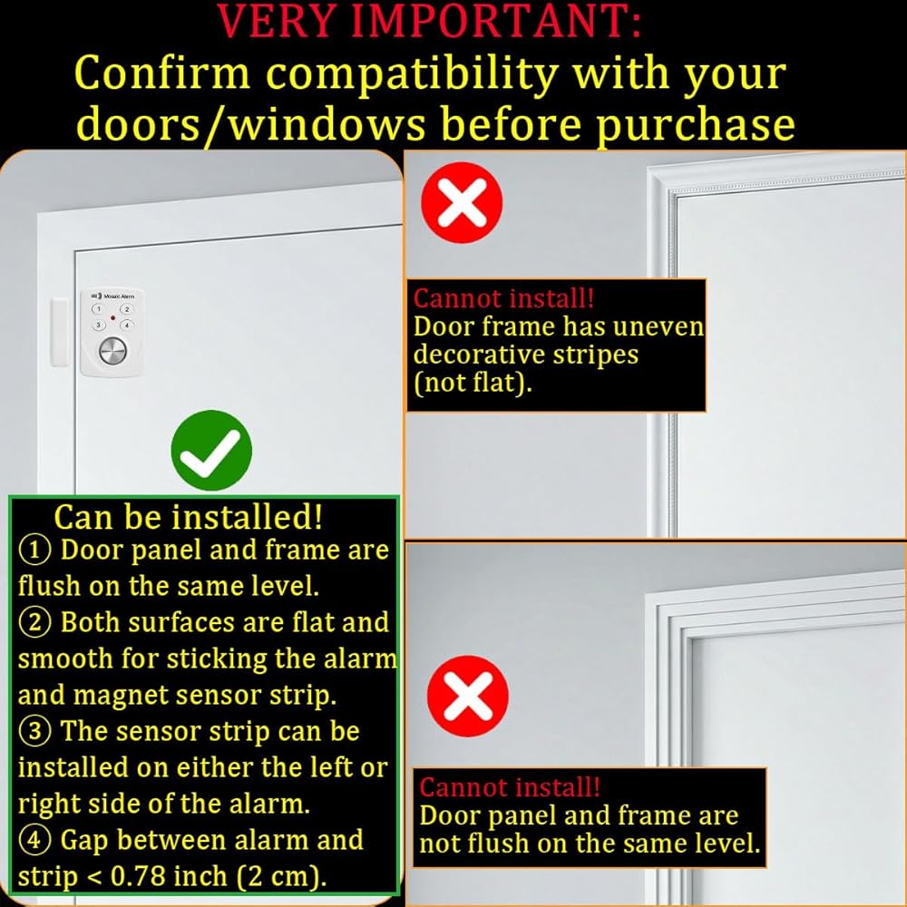 • كيف تؤكد ما إذا كان بابك أو نافذةك مناسبًا لتثبيت هذا المنبه؟ ① تحقق وقياس ما إذا كان هناك سطح مسطح بما فيه الكفاية: يتطلب حجم المنطقة 2.6 × 1.9 ″ على لوحة الباب أو نافذة لتركيب المنبه ؛ يتطلب حجم المنطقة 0.6 × 1.8 ″ على إطار الباب أو حافة النافذة لتركيب شريط المستشعر ؛ ② يجب أن يكون المنبه المثبت وشريط المستشعر في الأساس على نفس المستوى الأفقي (يُسمح بكمية صغيرة من الاختلال الرأسي) ، مع وجود فجوة قصوى لا تزيد عن 0.78 بوصة/2 سم. خلاف ذلك ، قد لا يعمل المنبه بشكل صحيح.