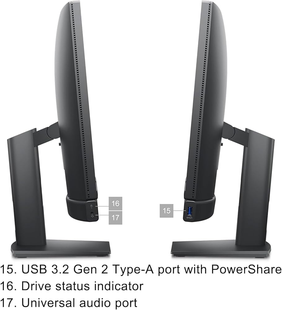 Below Display Ports: 1 USB 3.2 Gen 2 Type-C Port, Side Ports: 1x Universal Audio Port, 1x USB 3.2 Gen 2 Type-A Port with PowerShare port
