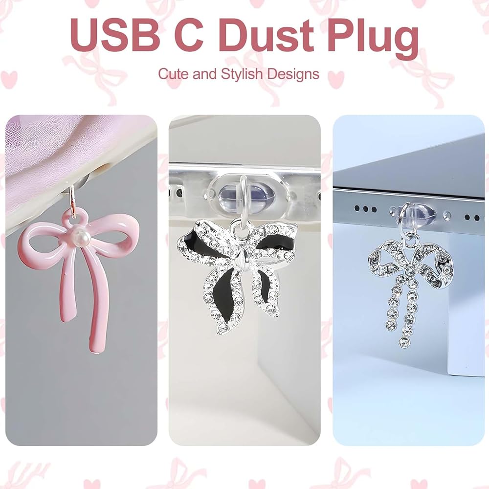 تصميمات لطيفة وأنيقة: تتميز هذه المجموعة من 6 مقابس USB C Dust 3 أنماط القوس الرائعة المختلفة ، مما يجعلها ديكورًا مثاليًا للسحر للهاتف للنساء والفتيات اللائي يحبن إضافة لمسة من الشخصية إلى أجهزتهن.