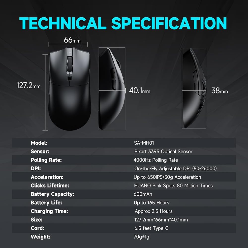 Focus PAW3950 Sensor Optical Sensor ومعدل الاقتراع 8000Hz - يدعم هذا المستشعر ما يصل إلى 30،000 DPI و 750 IPS لمعدل الاقتراع بحد أقصى 8K هرتز مع Dongle 8K. الأداء الدقيق للغاية مع قدرة Deviaiton 1 ٪ على DPI وقدرة على التتبع على الرقبة لضمان الدقة على مجموعة واسعة من الأسطح المسطحة ، وضمان كفاءة استخدام الطاقة والأداء اللاسلكي المنخفض في الأداء اللاسلكي جميع أنواع الأمور المعقدة بسهولة مع سهولة