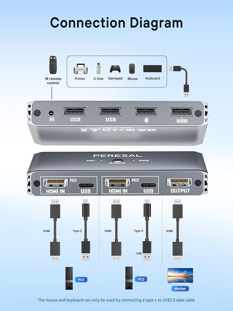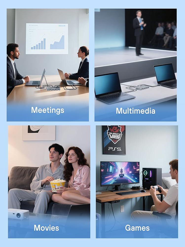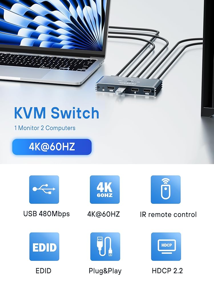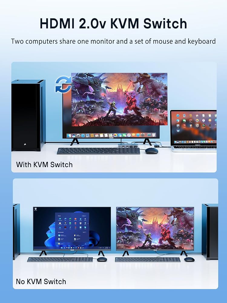【يستخدم على نطاق واسع وخالي من برنامج التشغيل】 مع توافق واسع ، يدعم مربع منفذ KVM Switch HDMI 2 Windows 11/10/8.1/8/7/VISTA/XP و MAC OS و Linux. فقط قم بتوصيل وتشغيل وبدون أي تثبيت. هذا مفتاح HDMI USB KVM متوافق أيضًا مع معظم أجهزة مصدر HDMI ، مثل Nintendo Switch/Switch 2 ، PS5/4/3 ، Xbox One ، مربع التلفزيون ، الكمبيوتر الشخصي ، الكمبيوتر المحمول ، إلخ.