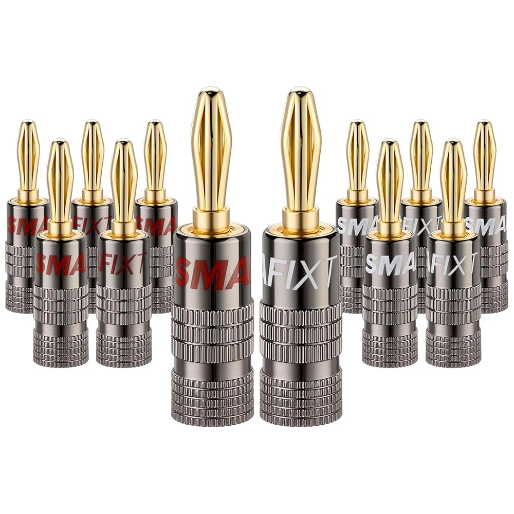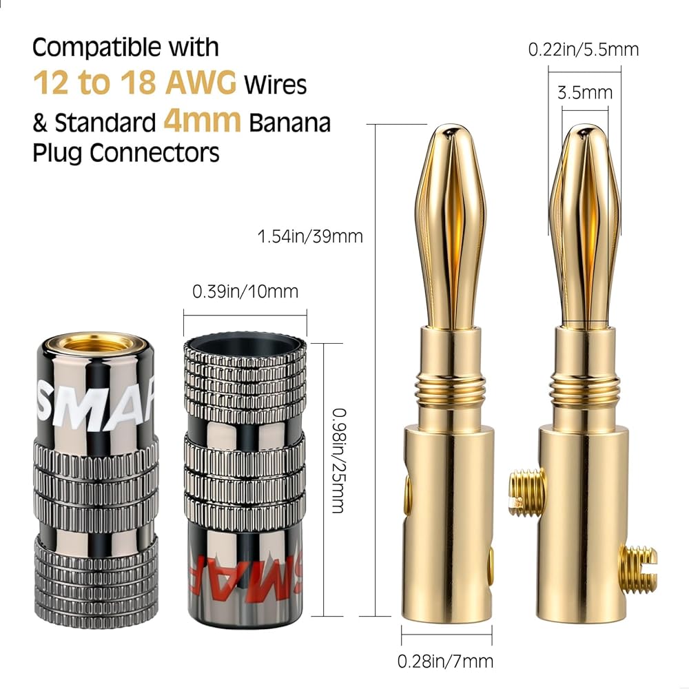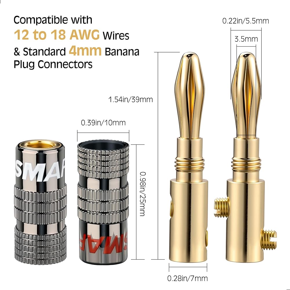 Experience Premium Audio Performance With Smafixt Banana Plugs Smafixt banana plugs deliver clear, high-fidelity sound with secure speaker wire connections. Made from brass and plated with 24K gold, they ensure excellent conductivity and corrosion resistance. The closed design with dual set screws keeps wires firmly in place—no soldering required. Red and white color coding makes polarity easy to identify, while elastic contact blades and an aluminum shell provide lasting durability. Compatible with 12AWG–18AWG speaker wires and standard 4mm banana plug connectors, these plugs are perfect for A/V receivers, amplifiers, home theater systems, surround sound setups, and banana wall plates. Upgrade your audio system with Smafixt for reliable connections and premium sound.
