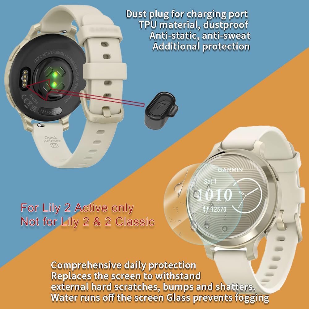Designed for Lily 2 Active, Includes 4 Tempered Glass screen protector + 4 charging dust plugs, not applicable to any other models. Please check your new Garmin Lily 2 Active model number and size before purchasing.(For Lily 2 Active only ,Not for Lily 2 & 2 Classic )