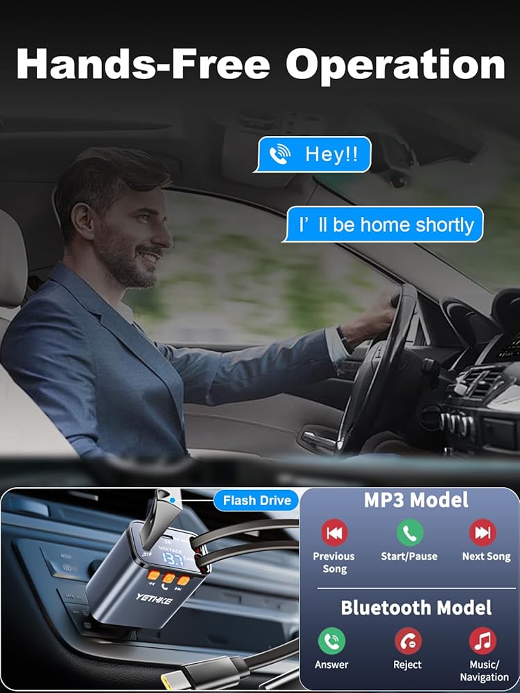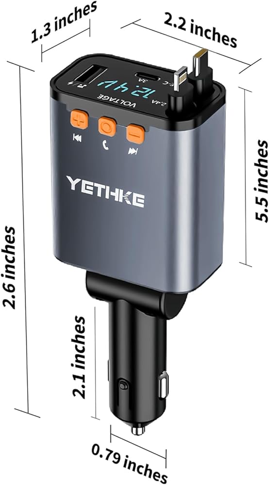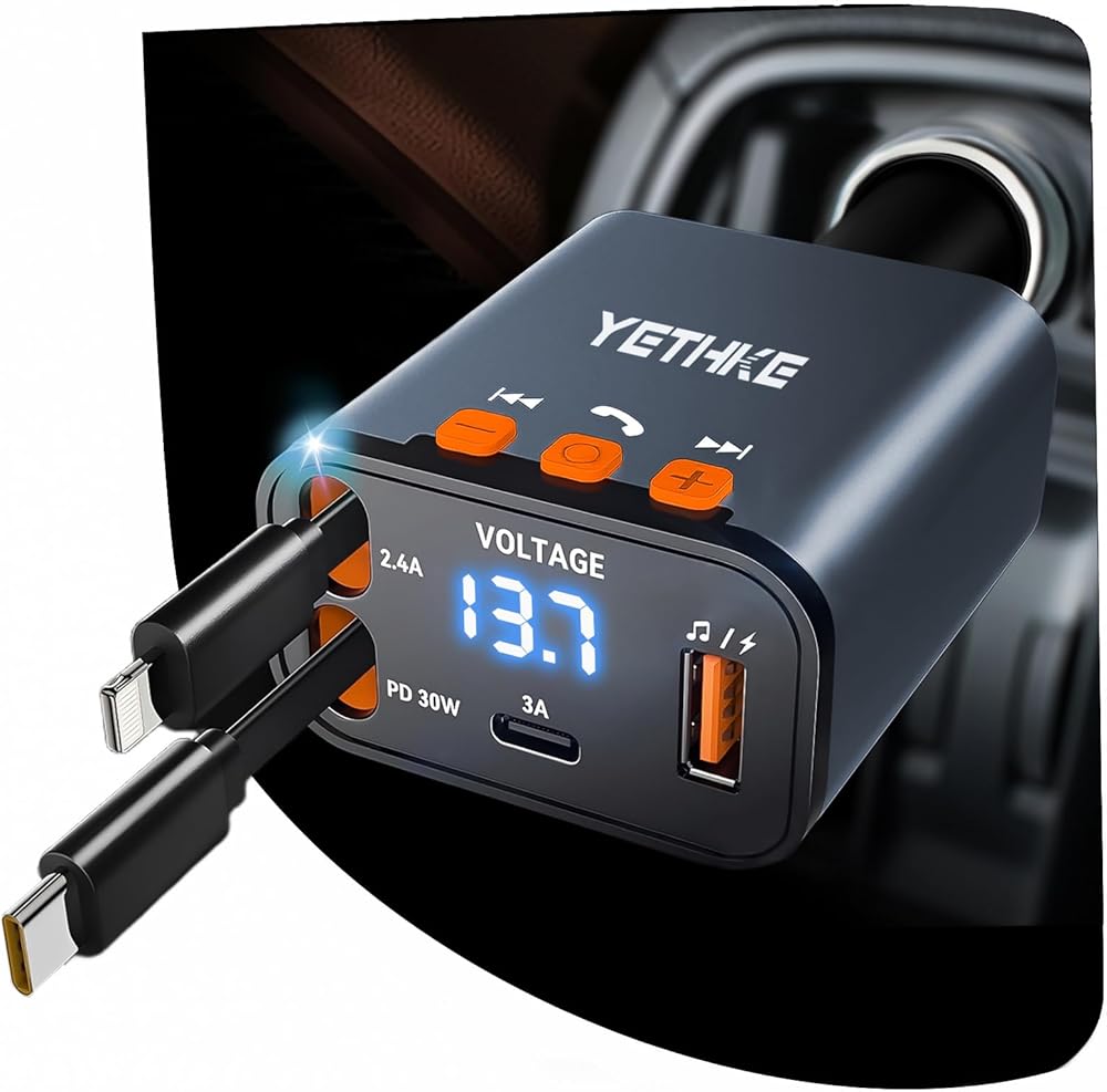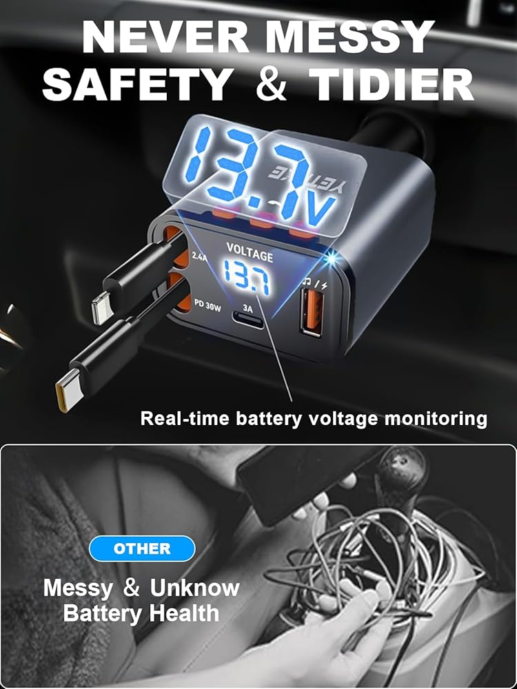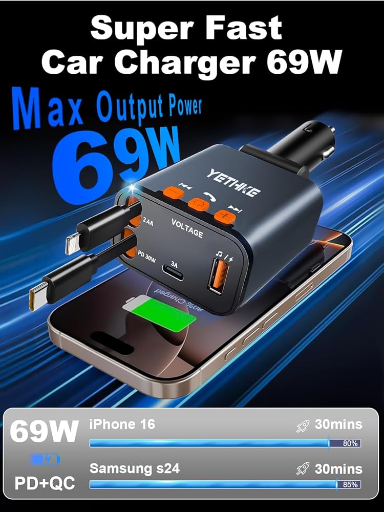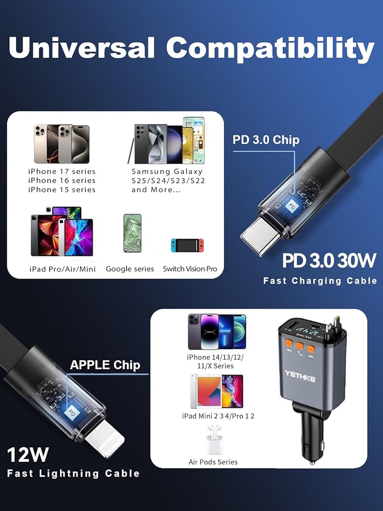 شاحن السيارة القابل للتراجع فائق السرعة: بالمقارنة مع شواحن السيارات الأخرى ، يتميز شاحن سيارة Bluetooth 5.4 القابل للسحب بمنافذ Car Type-C بحجم 30 واط وكابلات قابلة للسحب 12 واط ، بالإضافة إلى 15W USB-C ومنافذ USB-A 12W. شحن أجهزة Apple و Android بسهولة بسهولة في وقت واحد. يمتد كابل محول السيارة القابل للسحب إلى 80 سم. يتراجع/يمتد بسلاسة لتلبية احتياجات الشحن من المقاعد الأمامية والخلفية ، مما يقلل من الكابلات الفوضوية داخل السيارة والحفاظ على الداخل.