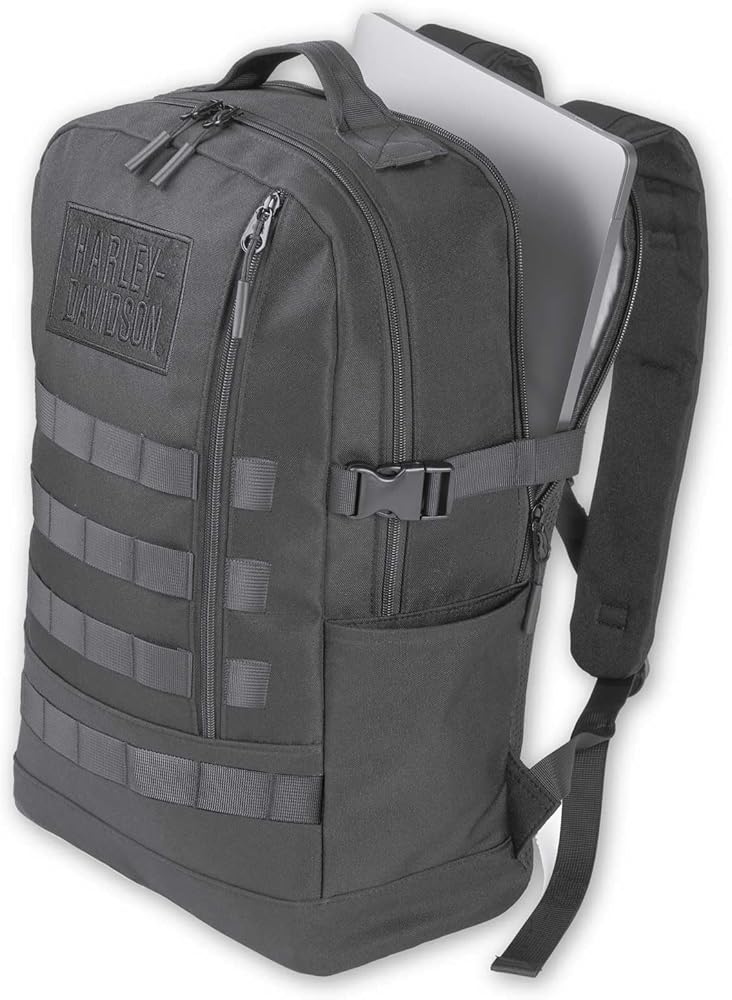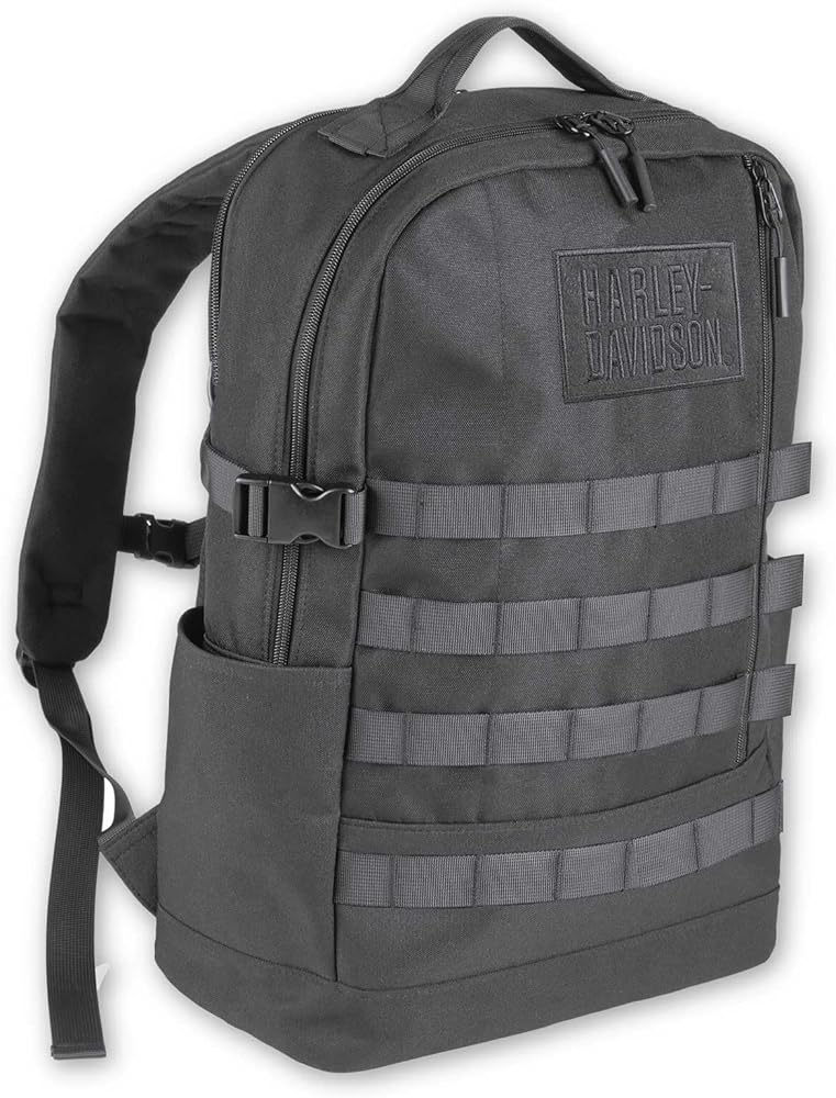 Harley-Davidson Rugged High-Density Polyester Rebel Daypack Backpack - Black. Made from rugged, high density polyester. Multiple zippered openings. Includes laptop compartment. Great riding size bag, to fill with all of your every day essentials. Adjustable shoulder straps. Embroidered velcro HD logo. 21L capacity. Size: 18" x 12" x 6".