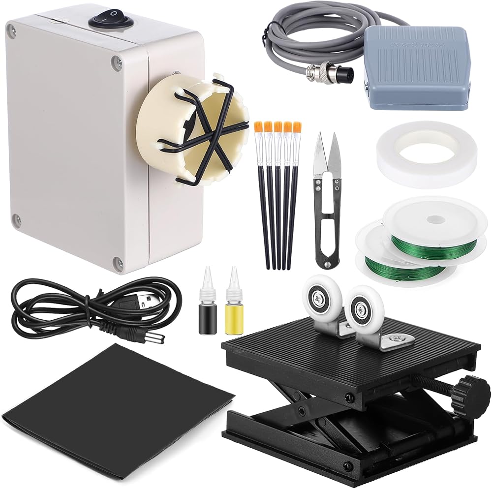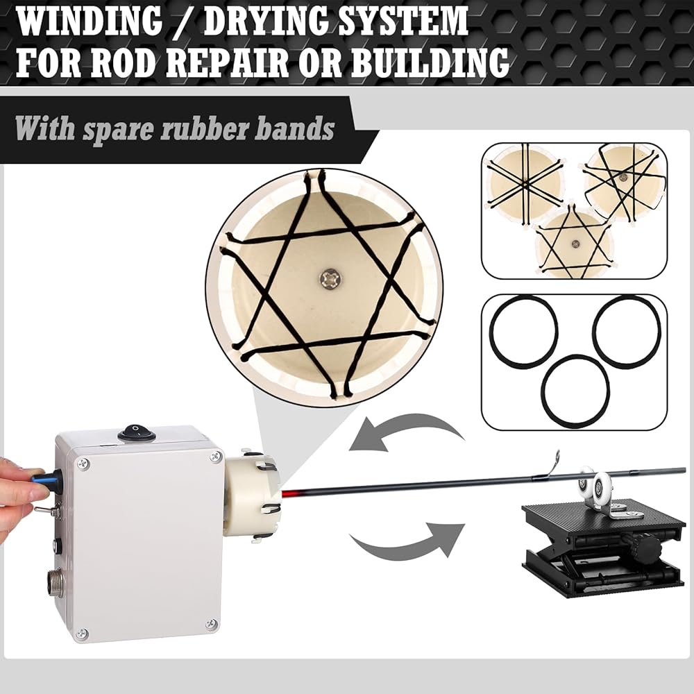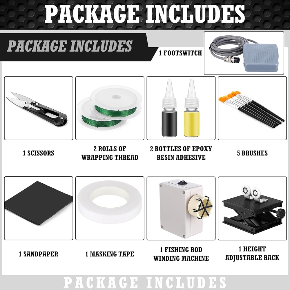 Fishing Rod Repair Kit: the kit includes 1 fishing rod winding machine, 1 height adjustable rack, 1 pedal switch, 2 rolls of wrapping thread, 1 roll of tape, 5 brushes, 1 scissor, and 1 sandpaper; These essentials will arm you with everything needed to tackle unexpected rod damages