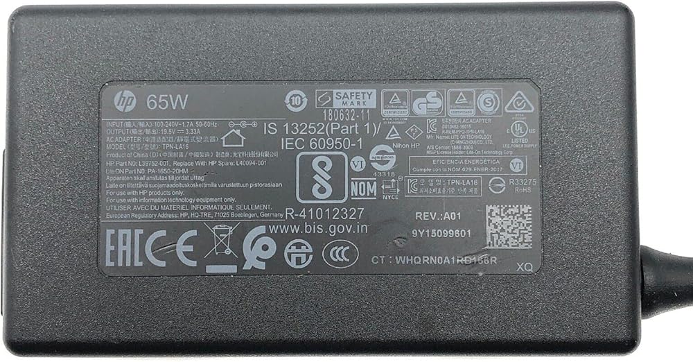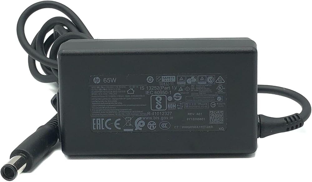 SPECIFICATIONS: Brand: HP; Wattage: 65W; Output: 19.5V 3.33A; Worldwide Input Voltage: 100-240V~1.7A 50-60Hz; Connector tip size: 7.4 x 5.0 mm