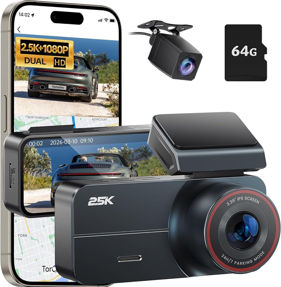 • Dash Cam 2.5k QHD : Yonvim Dash Cam التقاط كل تفاصيل طريق مع دقة QHD 2.5k المذهلة والعدسة الخلفية الأمامية 160 ° فائقة. تضمن العدسة الضوئية F1.8 Aperture + 8 طبقات أداءً استثنائيًا للضوء المنخفض ، بينما توفر Light Vision لقطات حادة 24/7. يتضمن بطاقة ذاكرة مجانية 64 جيجابايت للاستخدام الفوري
