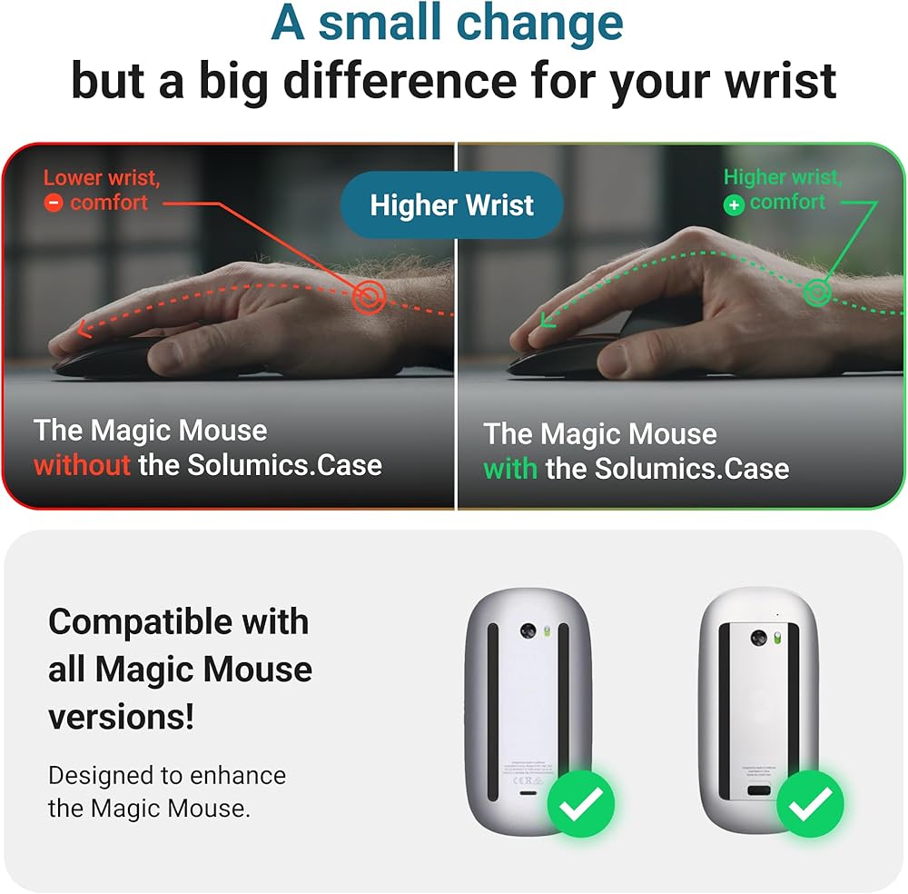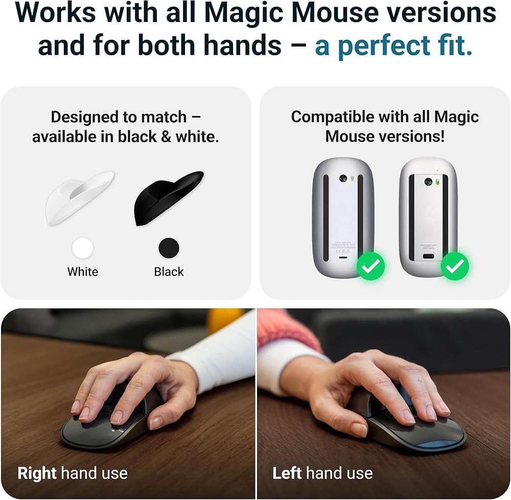 Many Magic Mouse users find themselves wishing for a more natural hand and wrist posture during longer work sessions. That's exactly where our Magic Mouse Case comes in: Wider side panels give your thumb and pinky more support, while the slightly raised profile eases strain on your wrist. Your fingers still glide effortlessly across the touch surface – scroll and swipe gestures work just like before. The case fits all Apple Magic Mouse versions with millimeter precision – whether it's Model 1 or 2 – and can be used comfortably by both right- and left-handed users. All benefits at a glance: ✔️ More comfort – wider grip and raised wrist support for a more natural hand position ✔️ Full functionality – glides smoothly on original glide bars with precise tracking ✔️ Quick setup – snap on, press lightly, and you're ready to go ✔️ Light & durable – only 32 g of high-quality PC/ABS plastic ✔️ Seamless design – available in white or black, fits any desk setup Whether you're editing videos, retouching photos, or handling daily office tasks – this small upgrade makes the Magic Mouse more ergonomic for many users, helping you work longer, more focused, and with greater ease. Give your Magic Mouse the comfort boost it deserves.