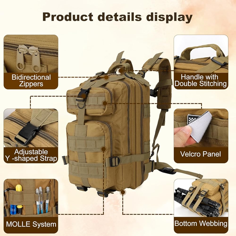 الميزات التكتيكية المحسّنة: تتضمن حقيبة الظهر Molle ميزات تكتيكية مثل المقابض المقواة ونقاط التعلق للإكسسوارات وأشرطة الضغط. يسمح نظام Molle بحقائب تكتيكية إضافية ، ويمكنك إرفاق أي تصحيح تريده. هذه الميزات تعزز الوظيفة وضمان الاستعداد في المواقف التكتيكية المختلفة.