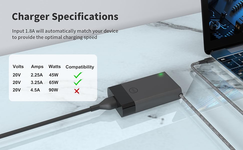 【POWJDWZ 65W USB C شاحن الكمبيوتر المحمول】 الإدخال: 100-240V ~ 1.5A 50-60Hz ؛ الإخراج: 5v ~ 3a / 9v ~ 3a / 12v ~ 5a / 15v ~ 4.33a / 20v ~ 3.25a (65w كحد أقصى). الموصل: USB Type-C