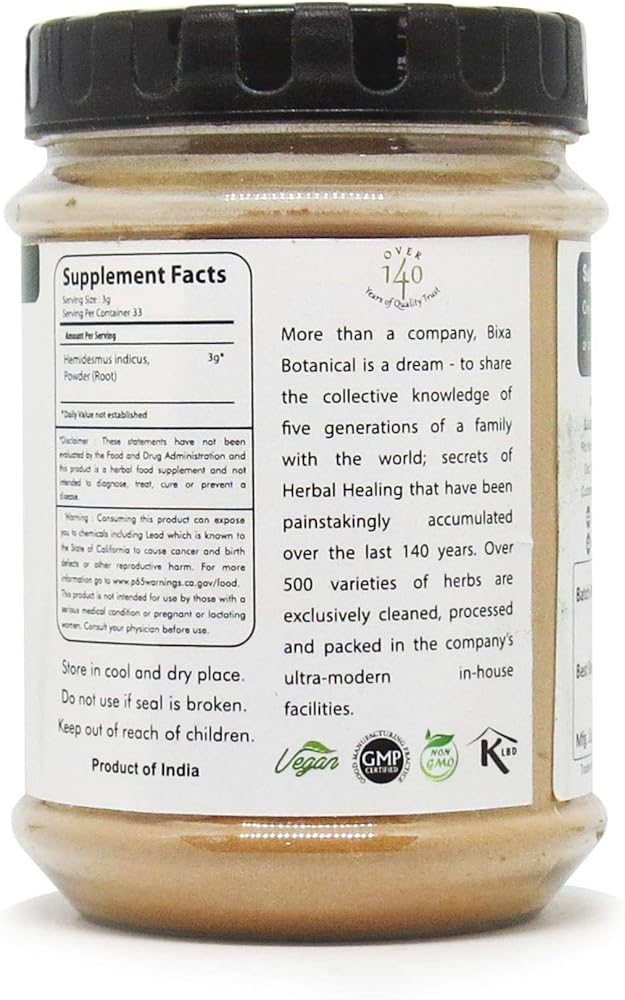 مسحوق جذور نبات السارساباريلا من بيكسا (HEMIDESMUS INDICUS) - 100 جرام (3.5 أونصة) عبوة من 1 | عامل تبريد وتنقية الدم الطبيعي | مكمل عشبي مضاد للأكسدة