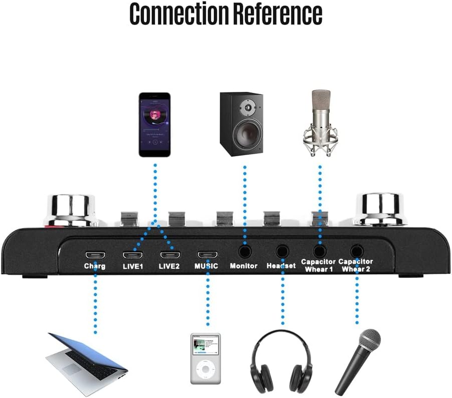 Live sound card for network broadcast, music recording, online singing, game, etc. Adopts dual digital signal processor and noise reduction chips to provide you with excellent sound quality.