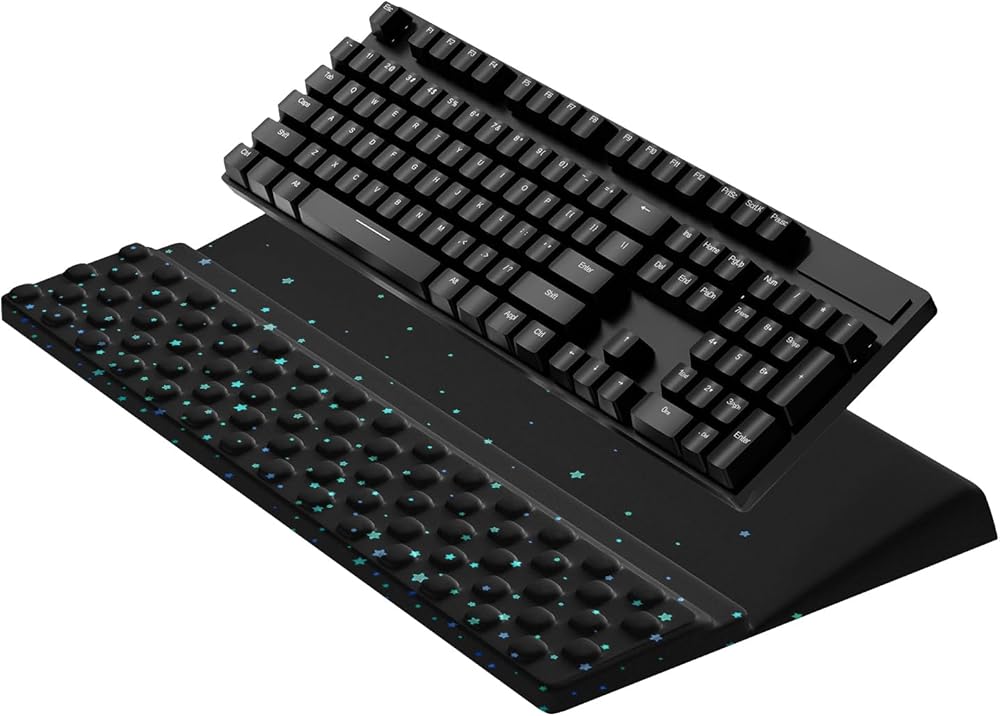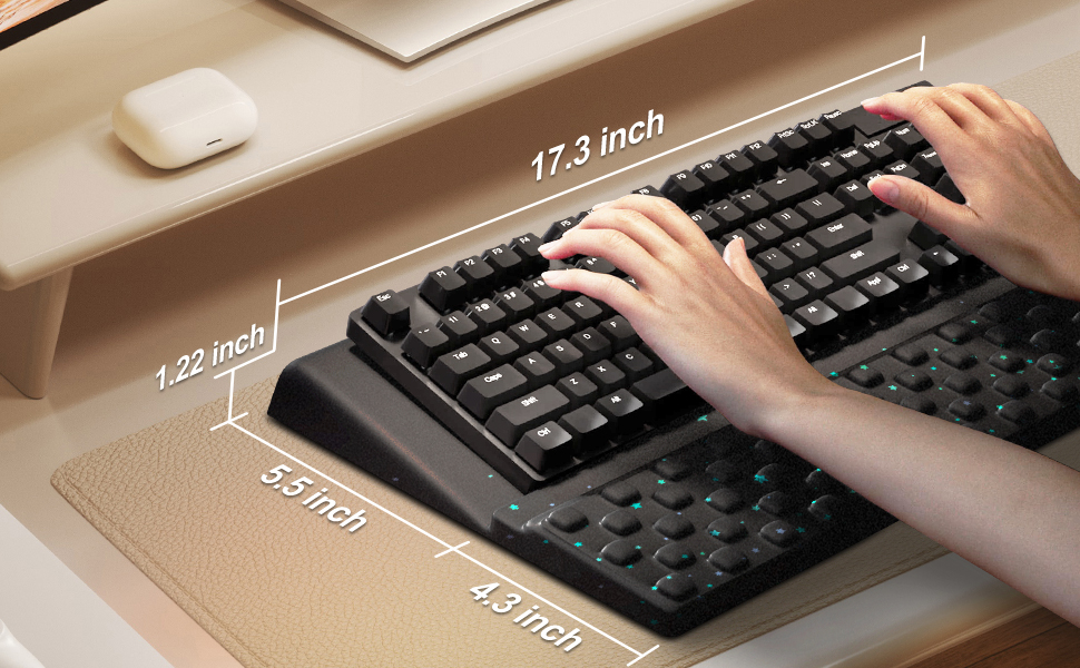 【حامل لوحة المفاتيح المائل المائل】 لوحة المفاتيح مع راحة معصم تتوافق مع معصميك للحصول على أقصى قدر من الراحة والدعم. توفر راحة المعصم المصممة بشكل مريح مستويات مختلفة من الارتفاع ، مما يتيح لك تخصيص إمالة لوحة المفاتيح للحصول على أقصى قدر من الراحة