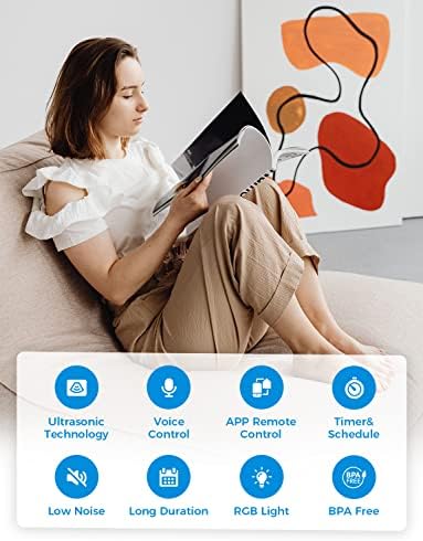 【جهاز تحكم عن بعد للتطبيق والتحكم الصوتي】متوافق مع Apple HomeKit وApple Watch وSiri وAmazon Alexa وSmartThings، يسمح لك بالتحكم في ميزات مثل كثافة الضباب وإعدادات المؤقت والجدولة ولون RGB والمزيد مباشرة باستخدام أوامر صوتية بسيطة، على سبيل المثال. "يا سيري، قم بتشغيل الناشر". واي فاي 2.4 جيجا هرتز فقط.