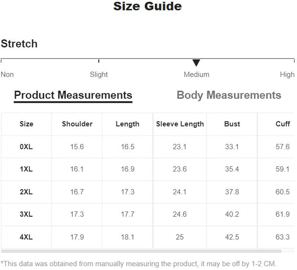 XX-Large Plus: Shoulder: 16.7", Length: 17.3", Sleeve Length: 24.1", Bust: 37.8", Cuff: 60.5"