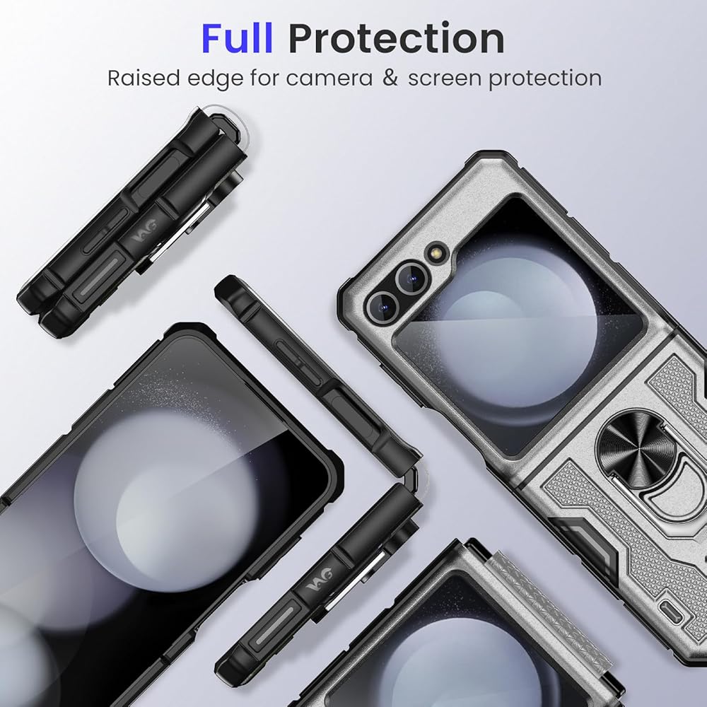 خضار لـ Z Flip 5 Case ، Galaxy Z Flip 5 Case مع حماية شاشة وحماية المفصلات ، و 360 درجة كيكستاند حلقة ، وغطاء الحماية الكامل للجسم لـ Samsung Flip 5 2023 - رمادي