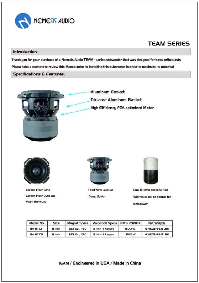- Nemesis Audio NA-8T D1 8" 1500W RMS Dual 1-Ohm Voice Coil DVC Car Subwoofer