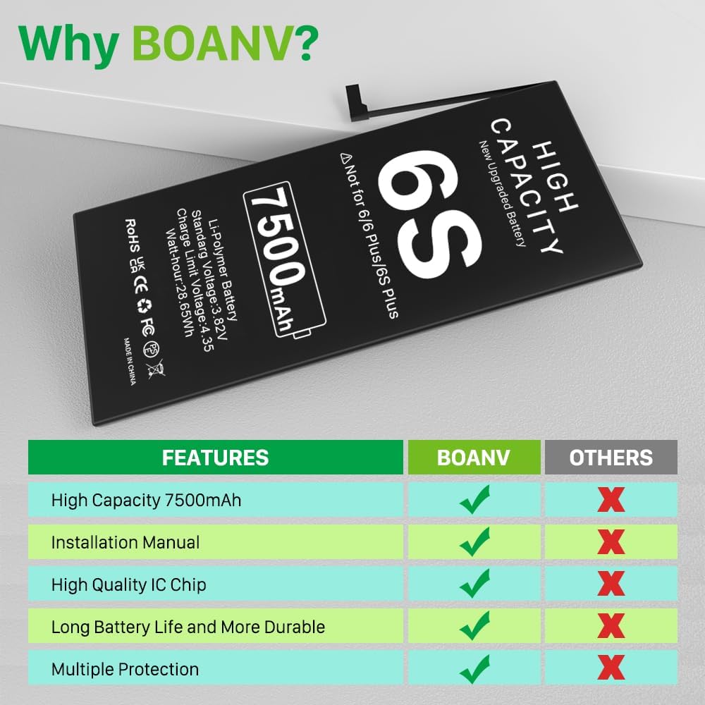 • 【النماذج المتوافقة】: مجموعة بطارية استبدال BOANV لجهاز iPhone 6S فقط ، الطراز A1633 ، A1688 ، A1700. (ملاحظة: غير متوافق مع iPhone 6 أو طراز iPhone الآخر).