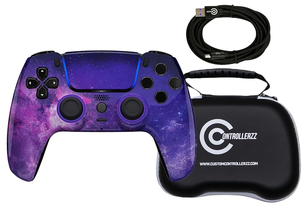 Upgrade your setup with the ultimate all-in-one gaming bundle from Custom Controllerzz. This complete set includes a brand new Galaxy Custom Wireless Controller compatible with PS5 and PC, a durable 9ft braided USB-C cable, and a universal travel case to keep your controller protected—whether you're on the go or storing it between sessions. Each controller is enhanced with our signature custom designs for a unique look and premium feel. Whether you're gaming on PS5 or PC, this bundle delivers the comfort, precision, and style serious gamers expect. Enjoy tangle-free charging, secure storage, and next-level aesthetics—all in one box. It's everything you need to elevate and upgrade your gaming experience.