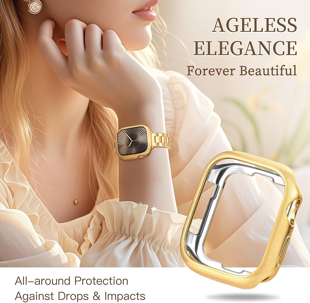 فرقة معدنية نحيفة لشرائط Apple Watch للنساء 41 مم 40 مم 38 مم من أشرطة IWATCH ذهبية مع علبة واقية ، حزام فاخر من الفولاذ المقاوم للصدأ لسلسلة Apple Watch Series 9 8 SE 7 6 5 4-Gold