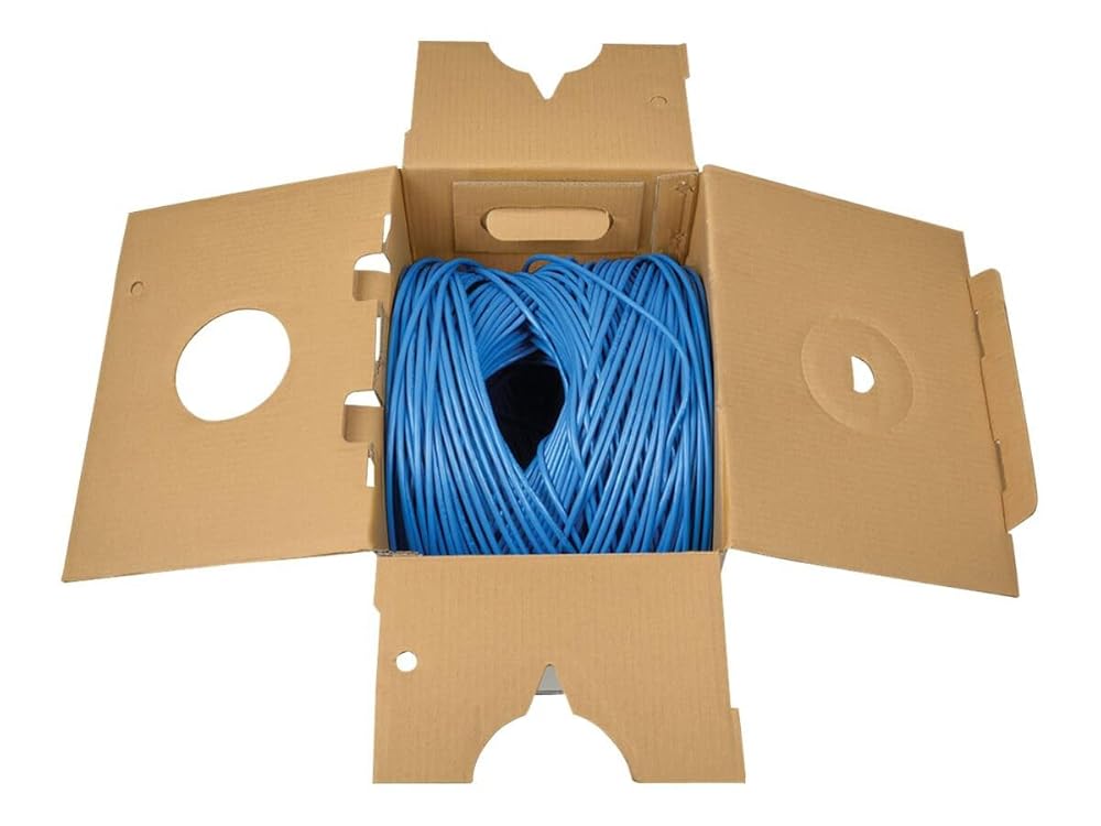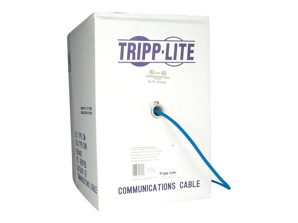 Tripp Lite Eaton N022-01K-BL 1000ft Cat5e UTP PVC CMR Solid Copper 24AWG Bulk Ethernet Cable Blue delivers exceptional performance with 350MHz bandwidth for high speed data voice PoE video and broadband applications This 4 pair unshielded twisted pair network cable supports Gigabit 1000BaseT Fast Ethernet 100BaseT voice low voltage and CCTV systems Ideal for Ethernet patch panels modular jacks wall plates data center cabling structured wiring and telecommunication installs Each 1000 foot spool contains continuous solid core conductors in a durable PVC CMR rated jacket for riser use and conduit runs The 24AWG pure copper wiring minimizes crosstalk maintains signal integrity and meets TIA EIA Cat5e testing standards TAA compliant for government and enterprise projects Cloud Care Pre Configured Bundle eligible to streamline procurement and deployment Perfect for bulk cable runs home offices server rooms network infrastructure and structured cabling solutions trust Tripp Lite for reliable bandwidth performance and value