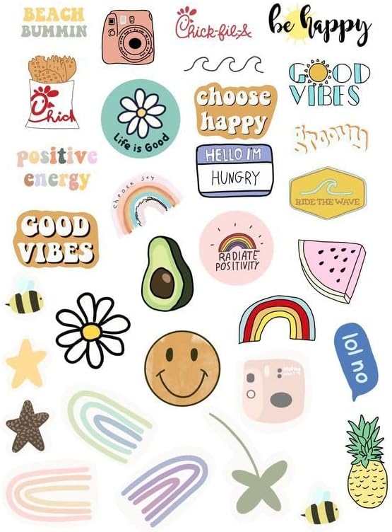 Add a delightful touch of personality to your belongings with this charming sticker collection! Featuring distinct sets - fun-themed designs with adorable illustrations, plus uplifting positive vibes stickers with rainbows, flowers, and motivational phrases. These high-quality decorative stickers are perfect for personalizing laptops, water bottles, notebooks, planners, or any smooth surface. The collection include 25 unique designs in vibrant colors and playful artistic styles.These stickers let you express yourself while adding a pop of color and fun to your everyday items. Mix and match different stickers to create your own unique combination and spread good vibes wherever you go!