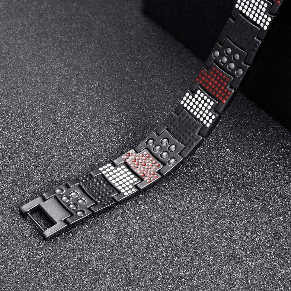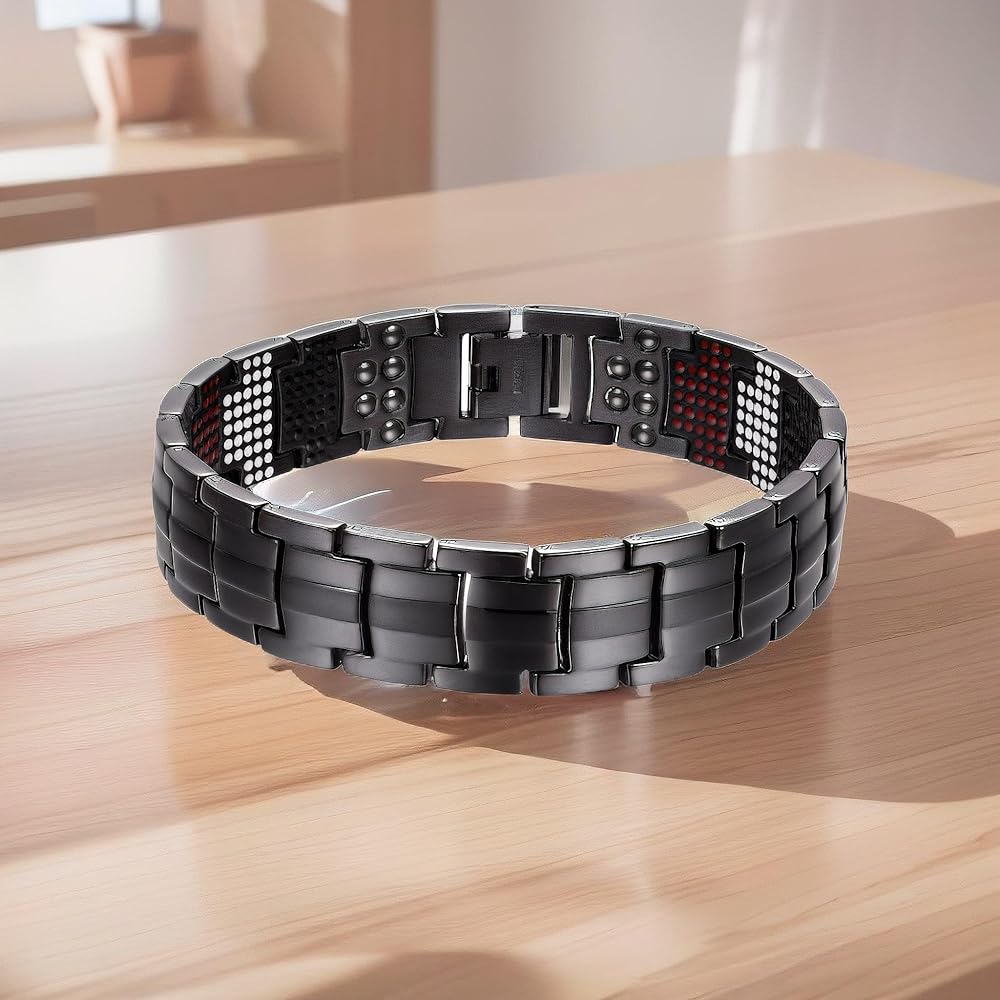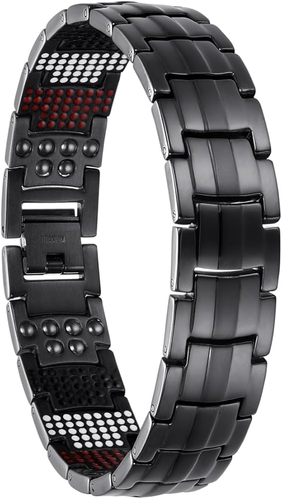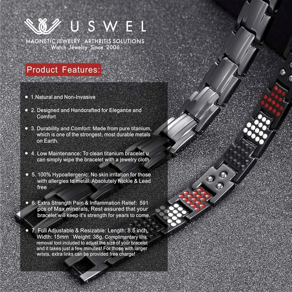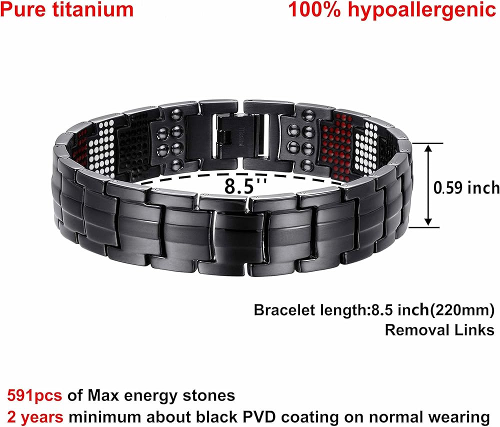 سوار رجالي: مقاس قابل للتعديل بطول 8.5 انش مع أداة إزالة الوصلات داخل العبوة، عرض 15 ملم، 38 غرام فقط. إنه أنيق للغاية بحيث لا يعلم أحد أنه سوار مغناطيسي.