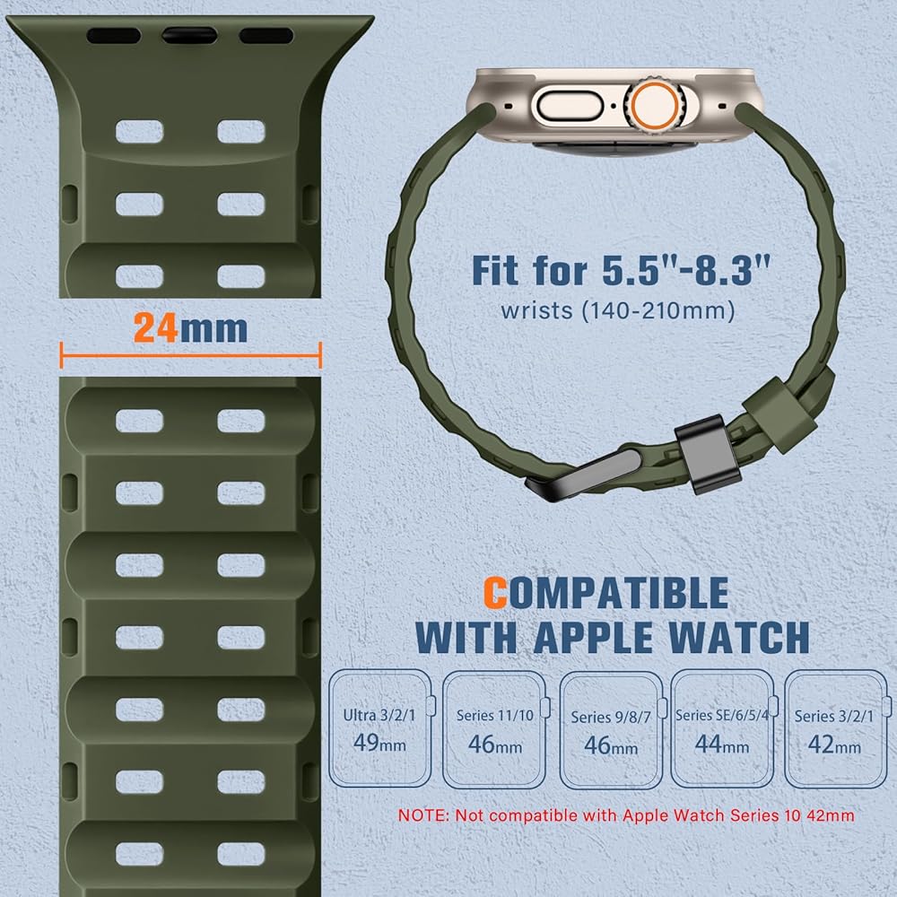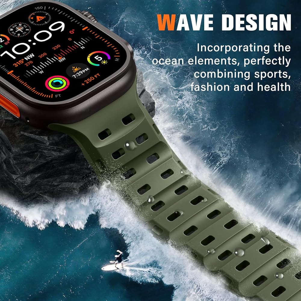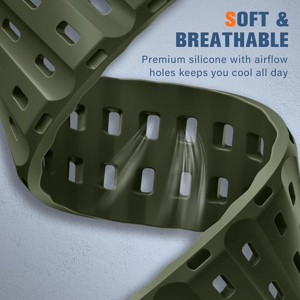 【الراحة الممتازة للارتداء طوال اليوم】 مصنوعة من السيليكون الفائق النعت الذي يبلغ وزنه بنسبة 30 ٪ من العصابات العادية ، تتميز هذه الفرقة Apple Watch Ultra 3 التي تتميز بثقوب تدفق الهواء للحفاظ على برودة البشرة. يضمن البناء المقاوم للعرق والمقاوم للماء الراحة أثناء التدريبات المكثفة مع الحفاظ على مرونة ضوء الريشة لارتداء المكاتب اليومية