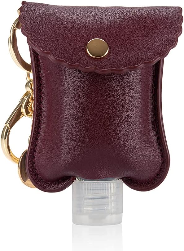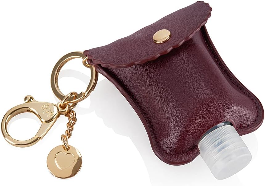 حامل معقم اليدين الخاص بنا مصنوع من جلد نباتي ويتميز بمشبك لوبستر ذهبي لربطه بسهولة بالحقائب