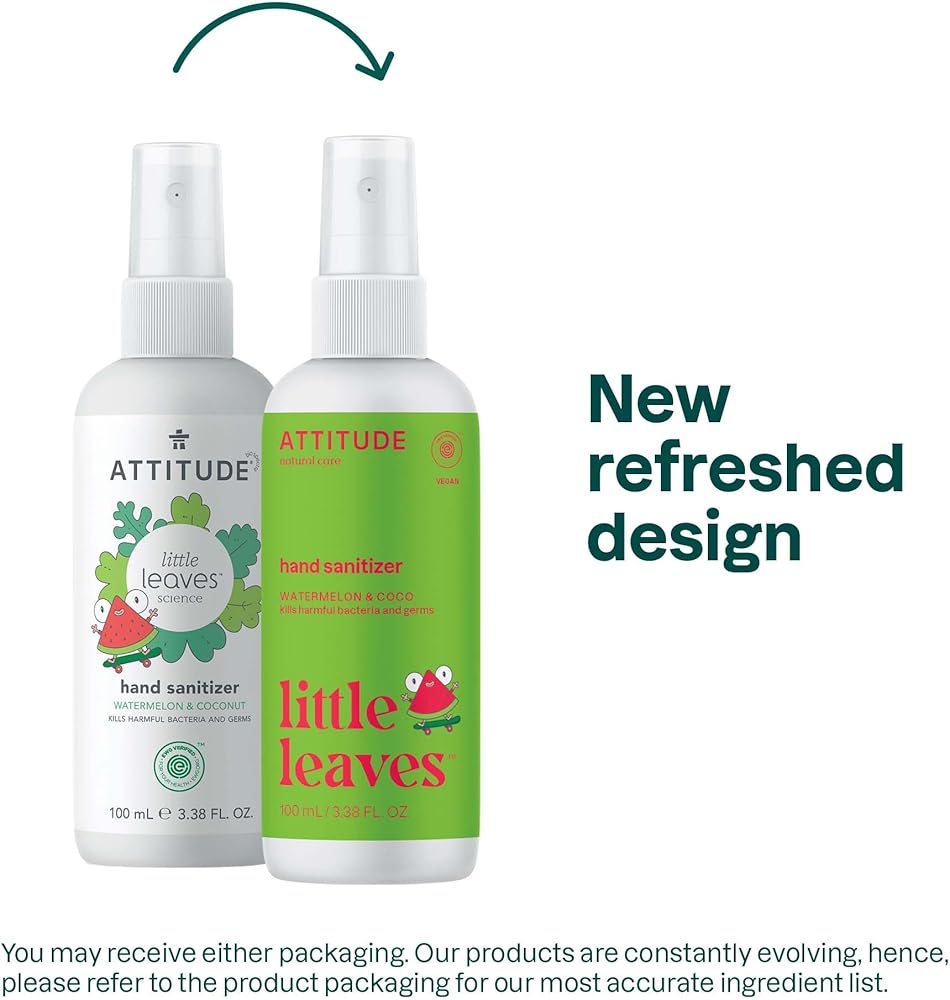 رذاذ مطهر لليدين للأطفال من ATTITUDE، حجم مثالي للسفر، يقتل البكتيريا والجراثيم، نباتي ولم يتم الإساءة إلى الحيوانات لتصنيعه، البطيخ وجوز الهند، 3.5 أونصة سائلة