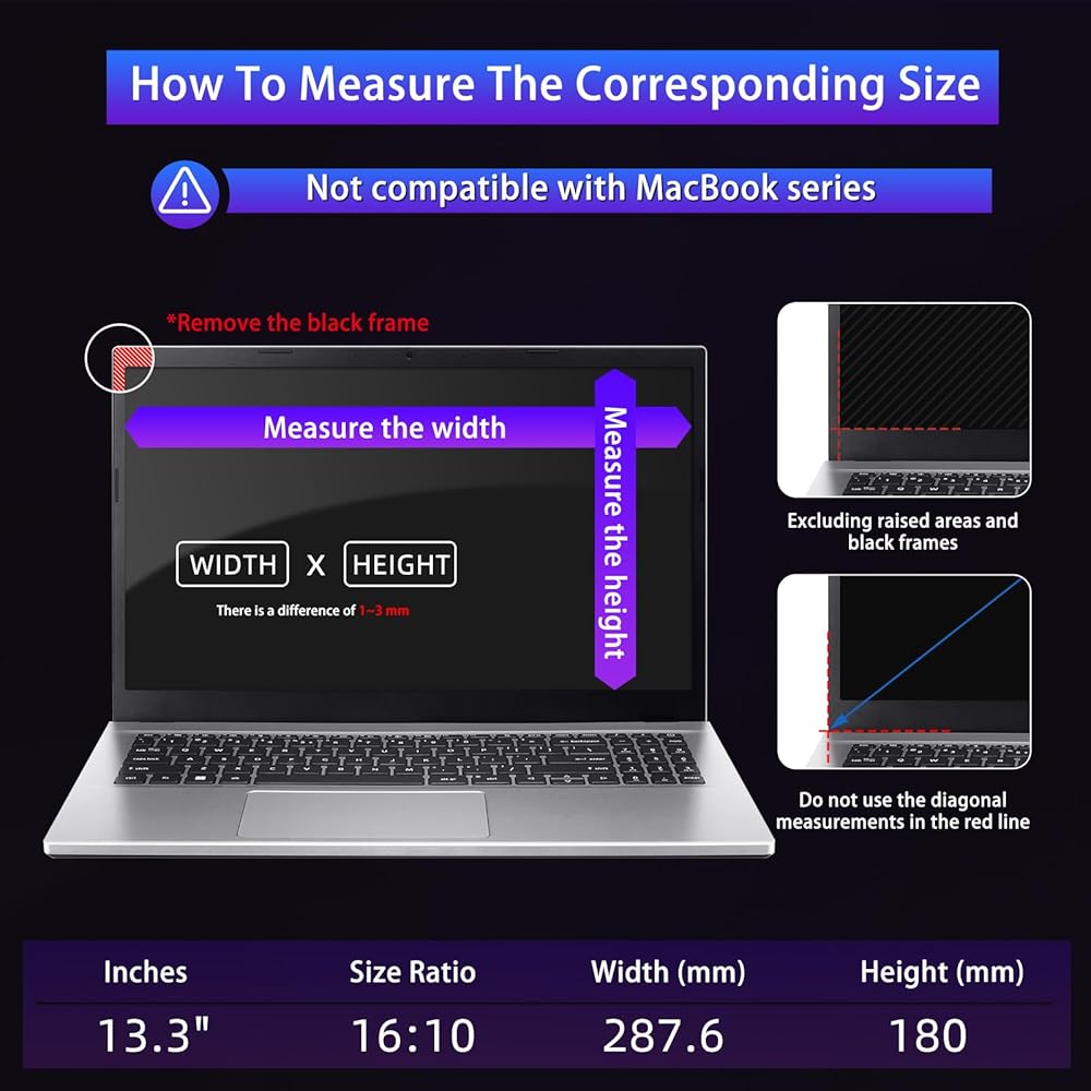 【Compatible Dimensions】22 inch Privacy Screen filter 16:10 Aspect Ratio Dimensions as followed:Width: 18.70 inch (475 mm), Height: 11.71 inch (297.5 mm). NOTE: The filter size may vary by 1-3 mm from the listed size, but this will not affect installation or normal use
