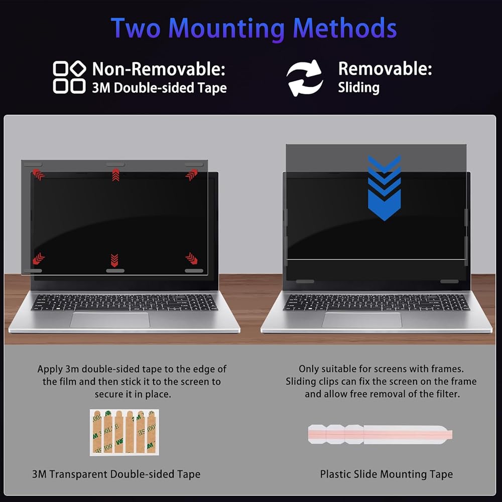 【Two Installation Methods】Designed for easy, bubble-free application. It's also easy to remove and reuse. We offer two installation methods for your convenience. The first method uses 3M double-sided tape to apply the protector directly to the LCD screen, applying it along the edges. The second method uses a sliding mechanism, attaching the included plastic clips to the device frame, and then sliding the filter into place