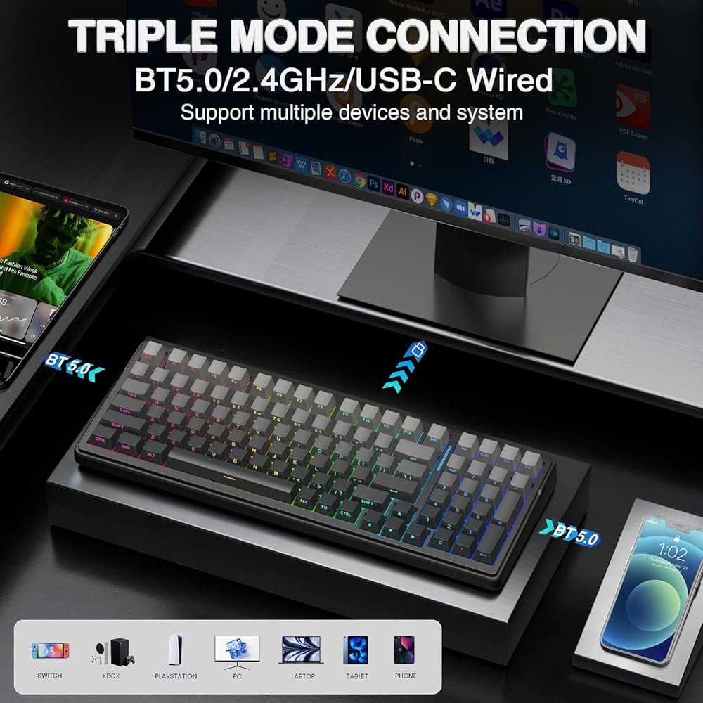 • لوحة المفاتيح Tri-Mode Connection: تعمل لوحات المفاتيح الميكانيكية اللاسلكية Aula F99 Pro مع تقنية Bluetooth ، وتوصيل سلكي لاسلكي و USB 2.4 جيجا هرتز ، وتوصيل ما يصل إلى خمسة أجهزة في نفس الوقت ، والتبديل بسهولة بواسطة مفاتيح الاختصار أو زر جانبي. F99 Pro Computer Keyboard مناسبة للكمبيوتر الشخصي وأجهزة الكمبيوتر المحمولة والأجهزة اللوحية والهواتف المحمولة و PS و Xbox وما إلى ذلك ، لتلبية جميع احتياجات المستخدمين. بالإضافة إلى ذلك ، تم تجهيز لوحة المفاتيح القابلة لإعادة الشحن ببطارية ذات سعة كبيرة تبلغ 8000 مللي أمبير في الساعة ، والتي تتمتع بعمر بطارية طويل الأمد