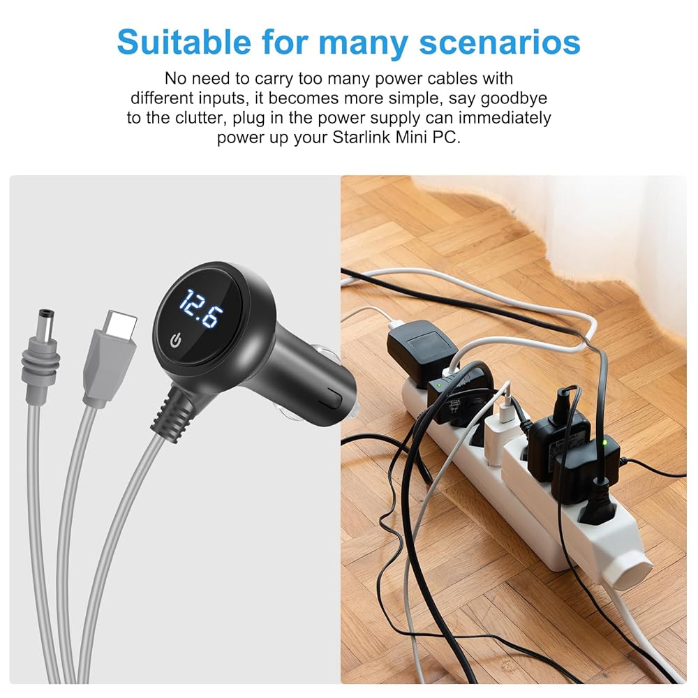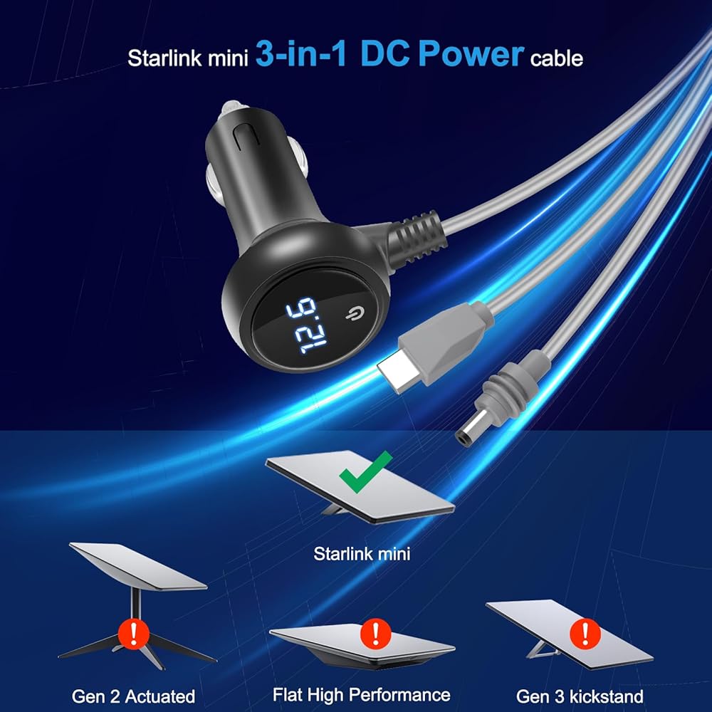 التوصيل والتشغيل: يمكن تشغيل الكابلات الخاصة بنا على الفور عن طريق توصيل منفذ USB-C أو محول ولاعة السجائر أو DC بمنفذ ولاعة سجائر ، ثم توصيل منفذ DC الناتج بهوائي STARLINK MINI. يوجد أيضًا شاشة على موصل ولاعة السجائر لرؤية الطاقة في الوقت الفعلي ، وقمنا بتصميم مفتاح تشغيل/إيقاف للسماح لك بفصل الطاقة في أي وقت عندما لا تكون قيد الاستخدام. يرجى ملاحظة أنه من أجل التأكد من أن جهازك يعمل بشكل صحيح ، يرجى التأكد من أن مصدر الطاقة هو 65 واط أو أعلى عند الاستخدام