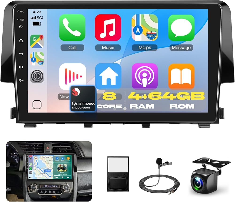 Stereo Carplay Car Stereo لـ Honda Civic 2016-2020 مع شاشة تعمل باللمس بحجم 9 بوصات ، [Qualcomm 8-Core 4+64GB] Upriding Android 13 Car Radio Android Auto BT5.1/DSP/HI-RES Audio/WiFi/SWC/GPS/OTA+Backup Cam Cam