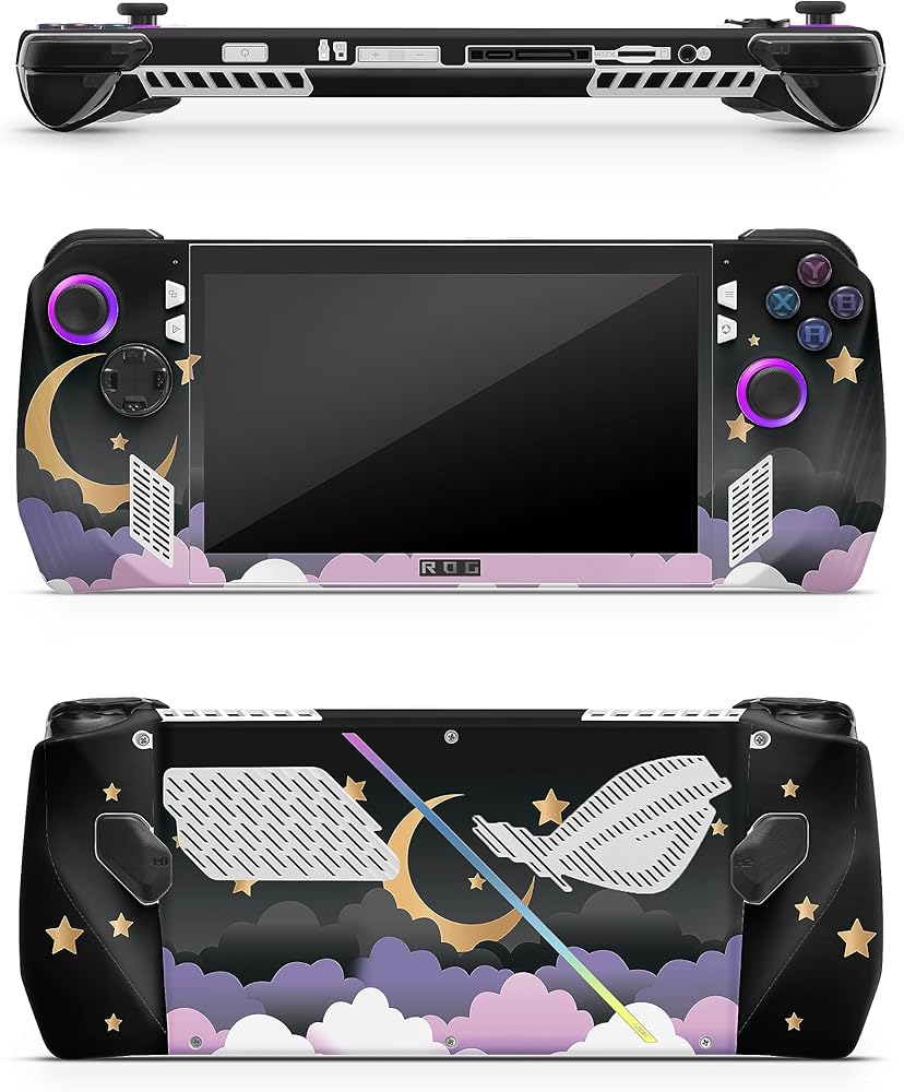 ZOOMHITSKINS Compatible for Asus Ally Rog X (2024) Skin Glitter Finish, Moon Black Sky Star Anime Kawaii Cute Purple Cloud Golden Stars Night, Durable 3M Vinyl Sticker, Made in The USA
