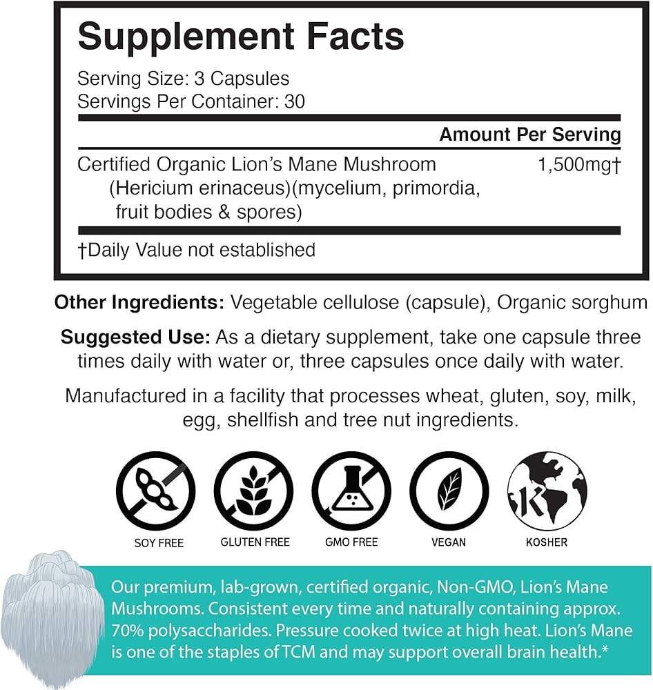 دعم الأعصاب: كبسولات فطر ليونز ماني العضوية قد تدعم صحة الأعصاب وعافيتها. تظهر الدراسات الأولية أن فطر ليونز ماني قد يدعم مستويات صحية من عامل نمو الأعصاب.