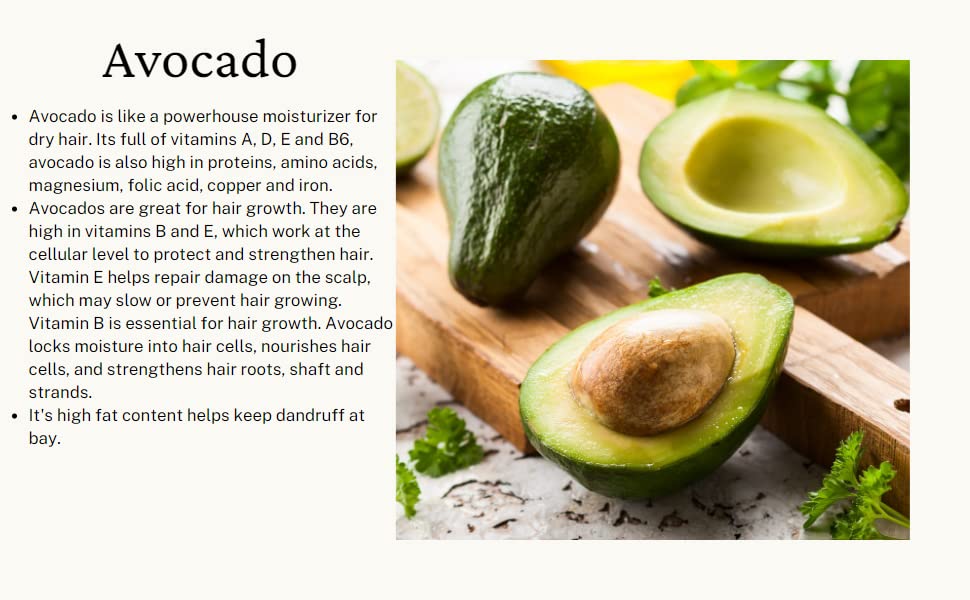 - تقوية الأفوكادو ، الغنية بفيتامين A.E ، B6 والبروتينات تحصن كل حبلا من الجذر إلى الطرف.