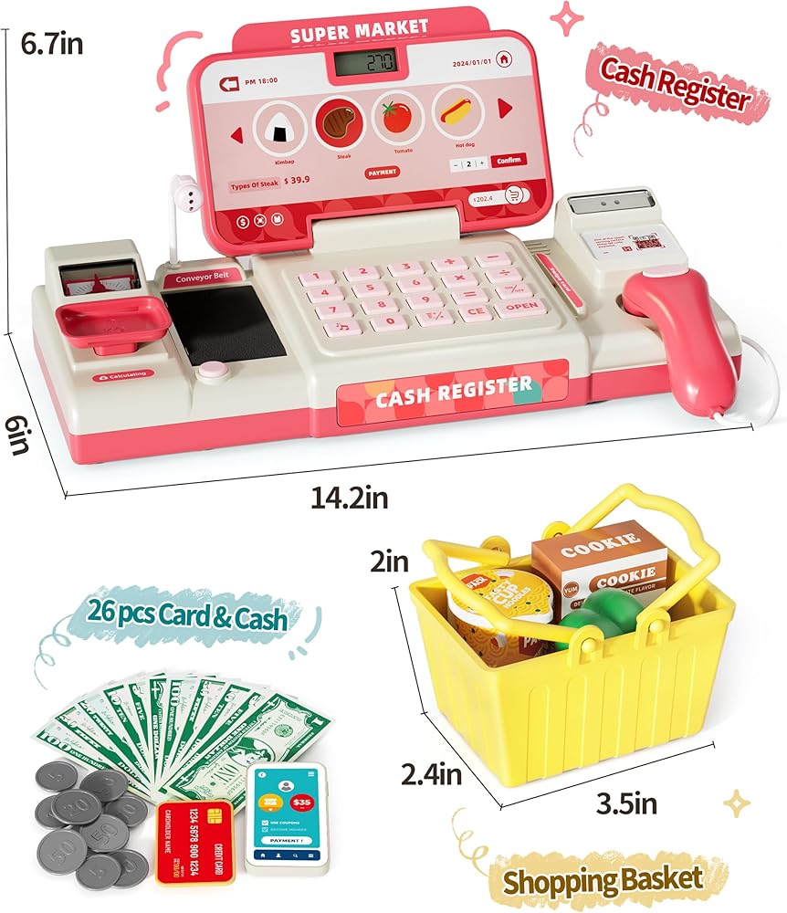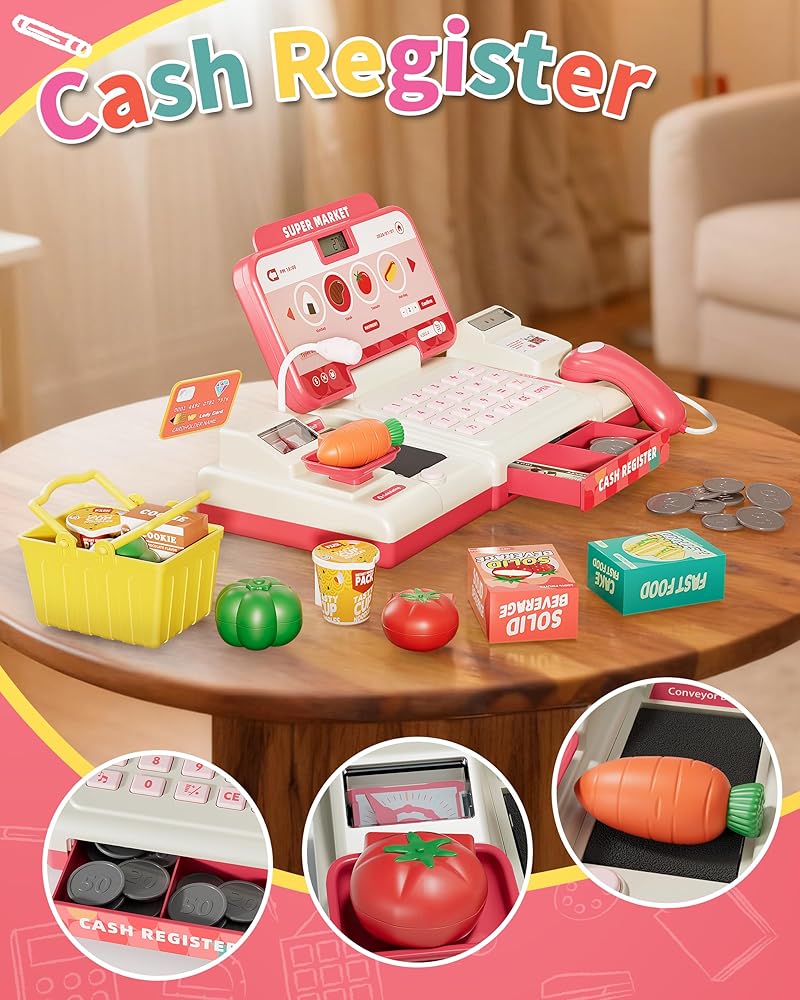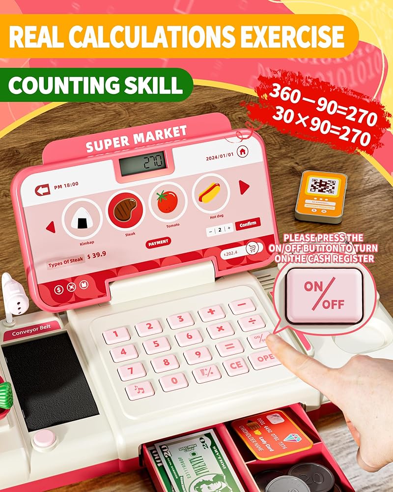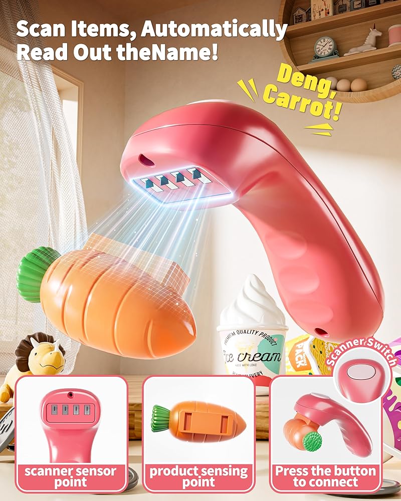 【Interactive Scanner】The electronic scanner brings play to life! When kids scan the items on the groceries, the register playfully announces the product names and prices. This enhances vocabulary, number recognition, and adds an engaging educational twist to playtime!