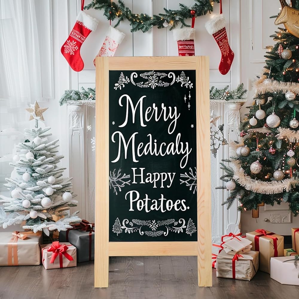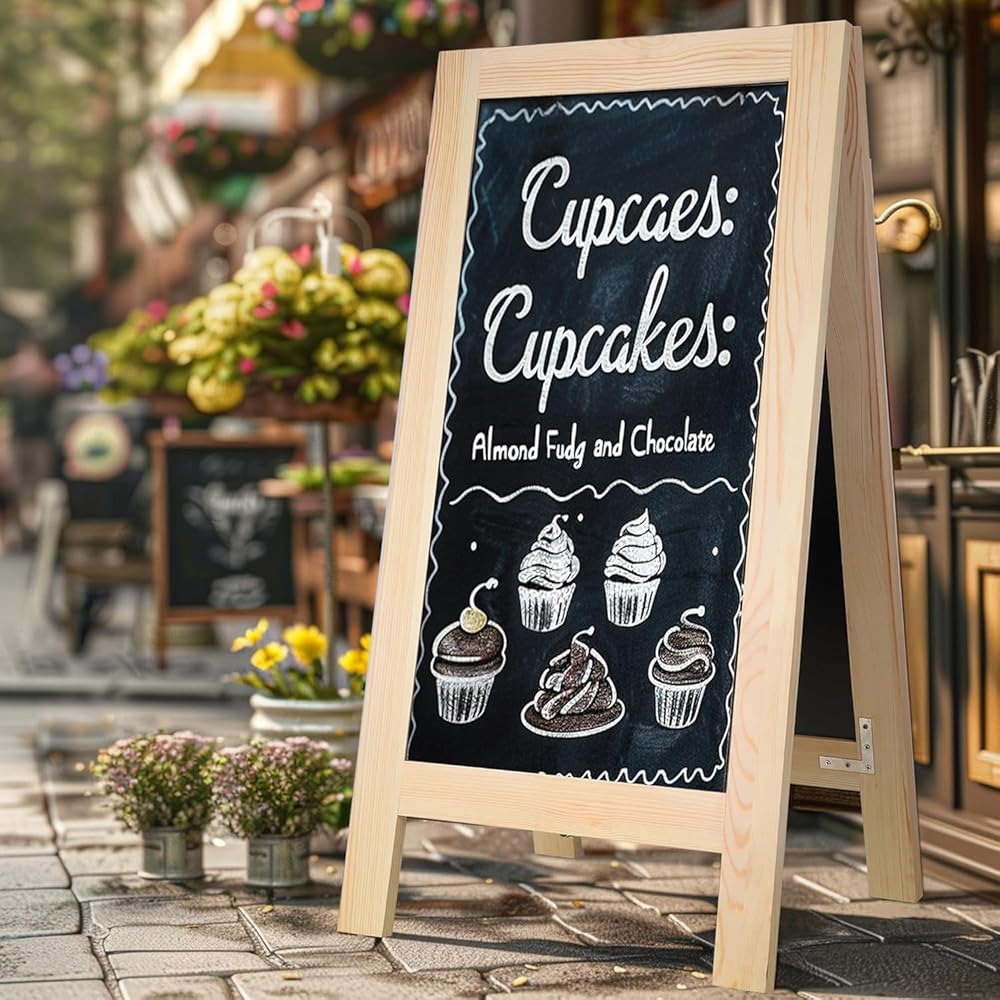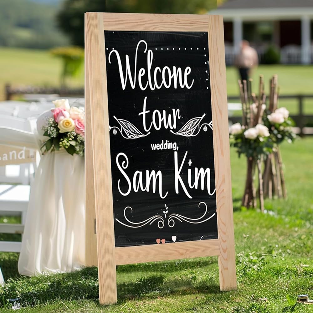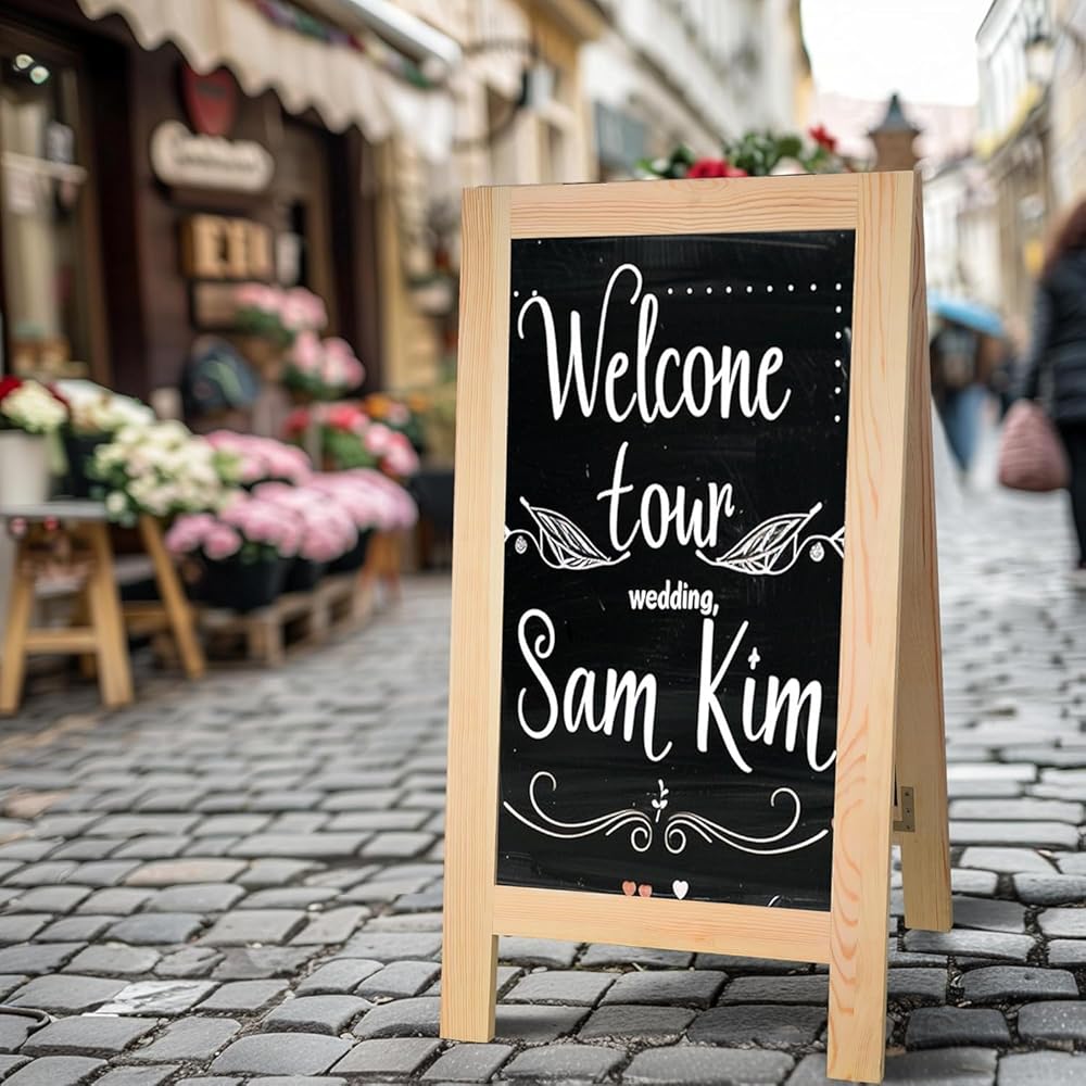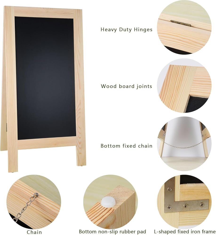 Foldable with Heavy-Duty Hinges :Our chalkboard sign is easy to store; it folds compactly with reinforced hinges and sturdy metal chains. Perfect for small spaces or on-the-go use. Works with both chalk and chalk markers for eye-catching displays.