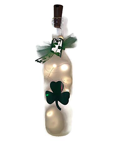 This is a 12" frosted wine bottle. A green shamrock is in Glitter vinyl, no glitter will rub off. Detailed painting around the shamrock white. A string of lights fills the inside and you can place it anywhere!